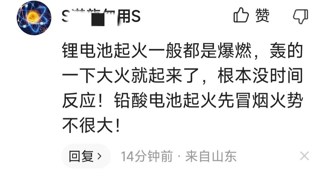 另一位懂行的网友对此说法也表示了赞同:锂电池起火就是“轰”的一下,根本没时间反应,铅酸电池起火是先冒烟,而且火势不会很大,虽然性能比锂电池差一些,但安全系数却大大增高了。