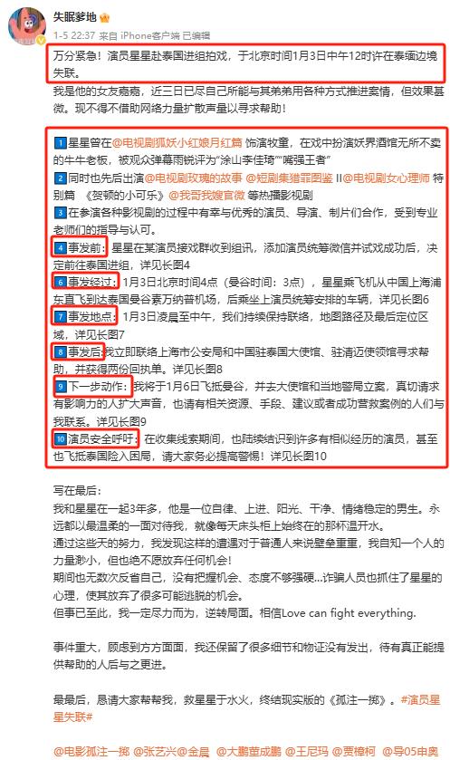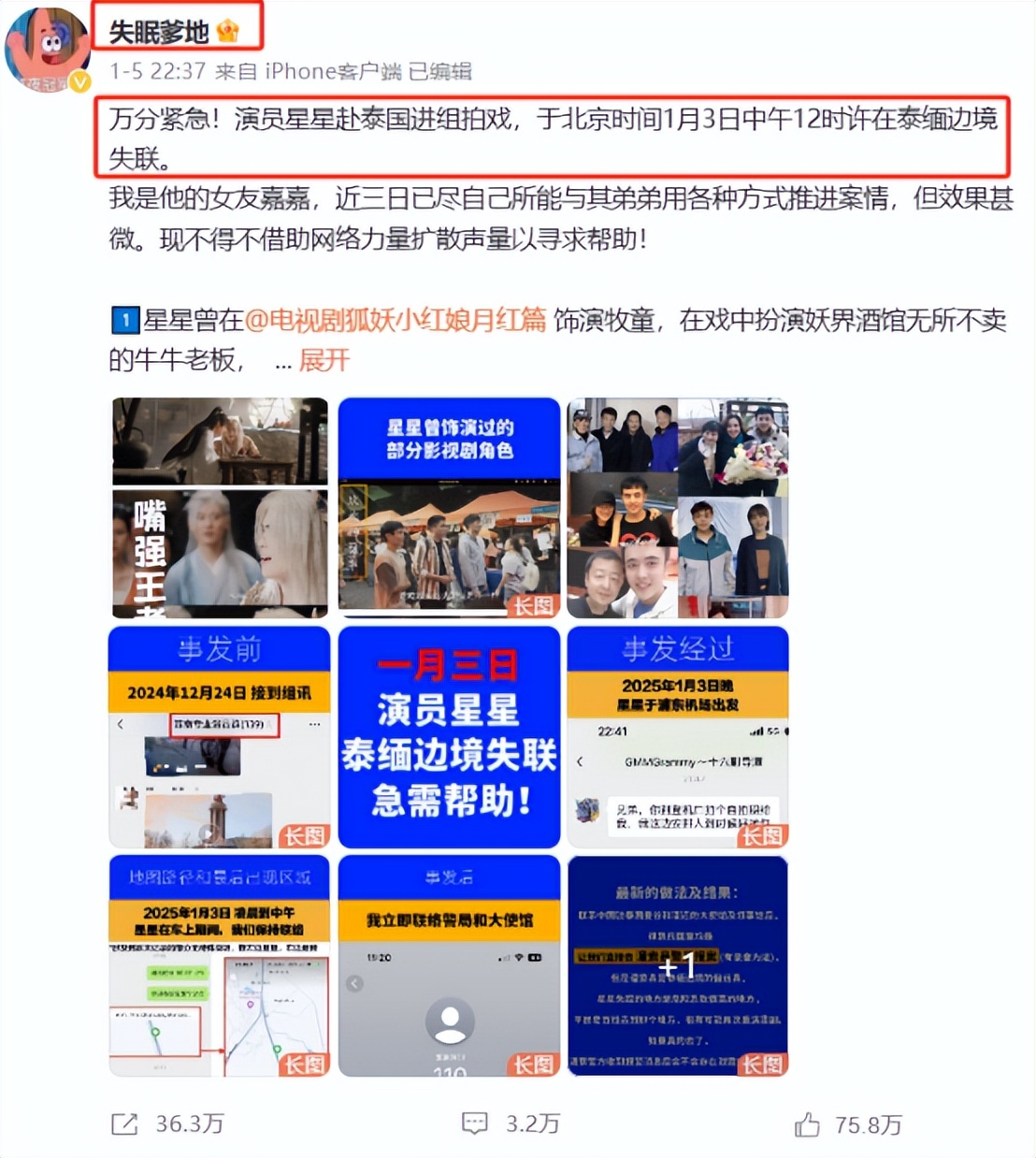 一场惊心动魄的失联事件“演员星星在泰缅边境失联,急需帮助!”1月5日,一条来自网友嘉嘉的求助信息打破了冬日的宁静。嘉嘉是演员王星(艺名:星星)的女友,她的焦急与无助迅速引发了广泛关注。
