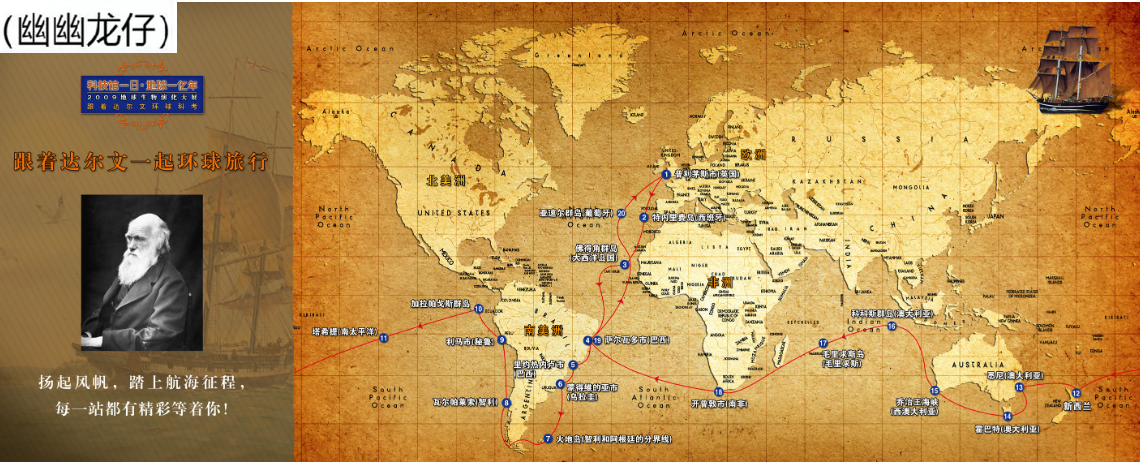 1831年,达尔文在剑桥大学毕业,在亨斯洛教授的鼓励、推荐下他以“博物学家”的身份参加了同年12月27日出发的英国海军“贝格尔号”舰环绕世界的科学考察航行。他们先在南美洲东海岸的巴西、阿根廷等地和西海岸及相邻的岛屿上考察,然后跨太平洋至大洋洲,继而越过印度洋到达南非,再绕好望角经大西洋回到巴西,最后于1836年10月2日返抵英国。达尔文对沿途的动植物和地质结构等进行了大量的观察和采集,进化论的思想在他的心中深深扎下了根。