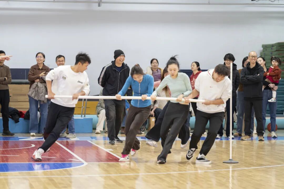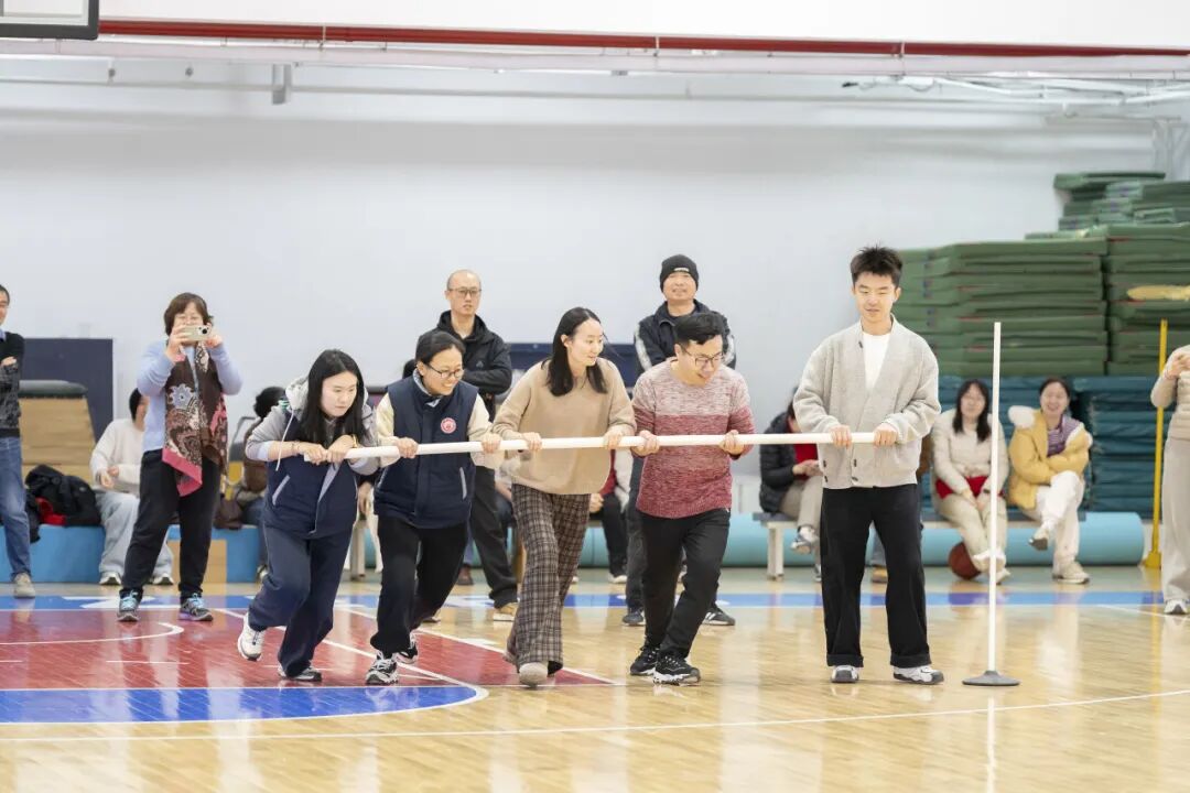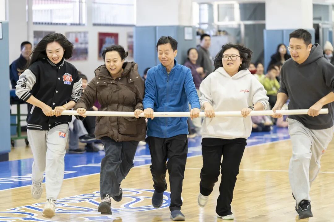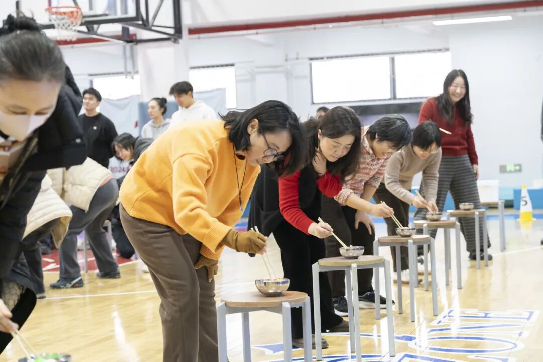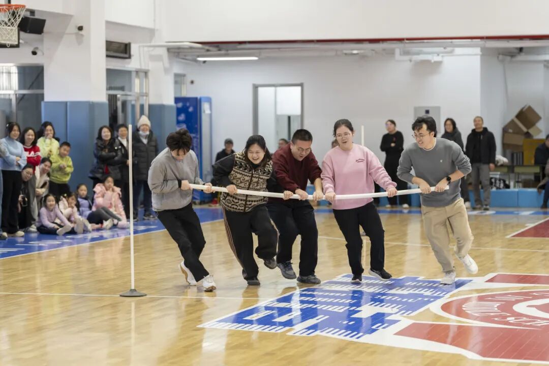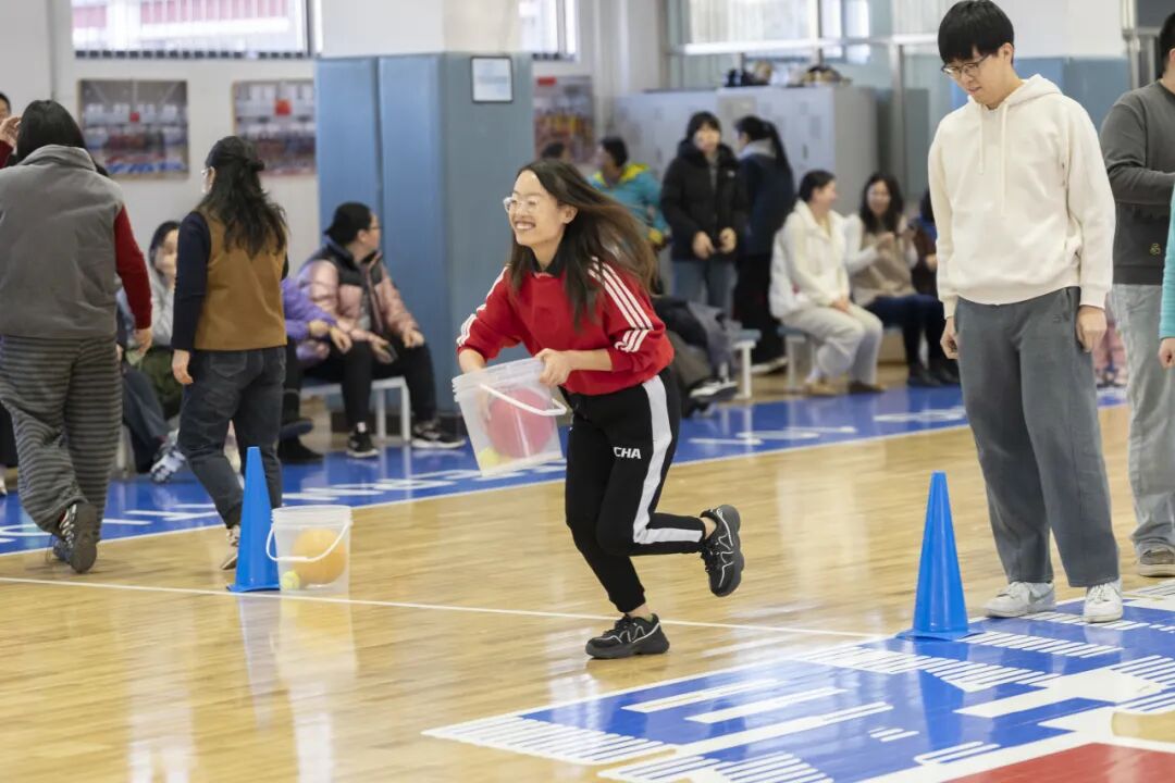 随后,教职工趣味运动会也在学校室内篮球馆火热举行。老师们积极参与各项趣味项目,现场笑声不断、气氛热烈。比赛不仅缓解了工作压力,也增强了教师团队的凝聚力和协作精神。