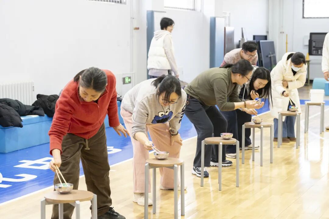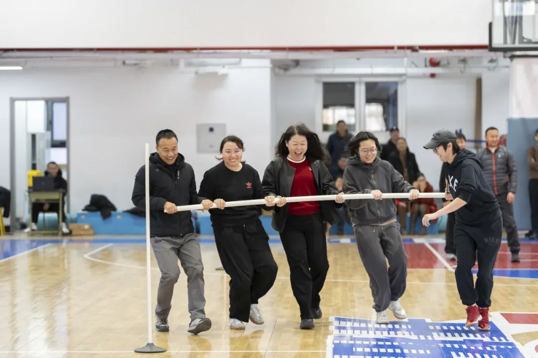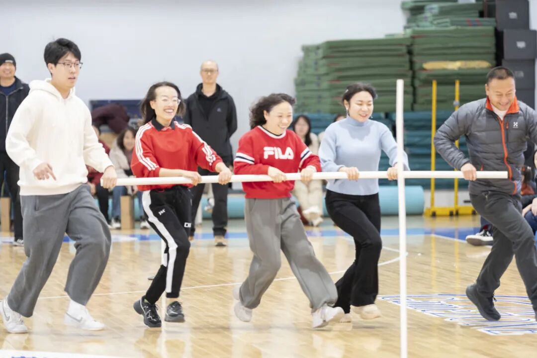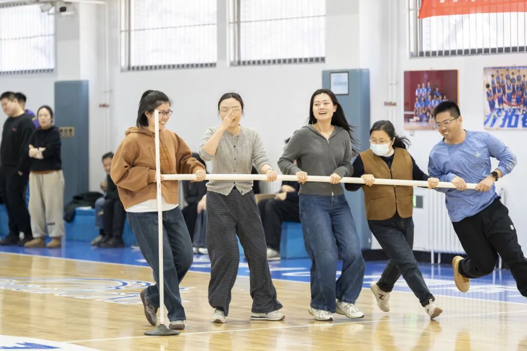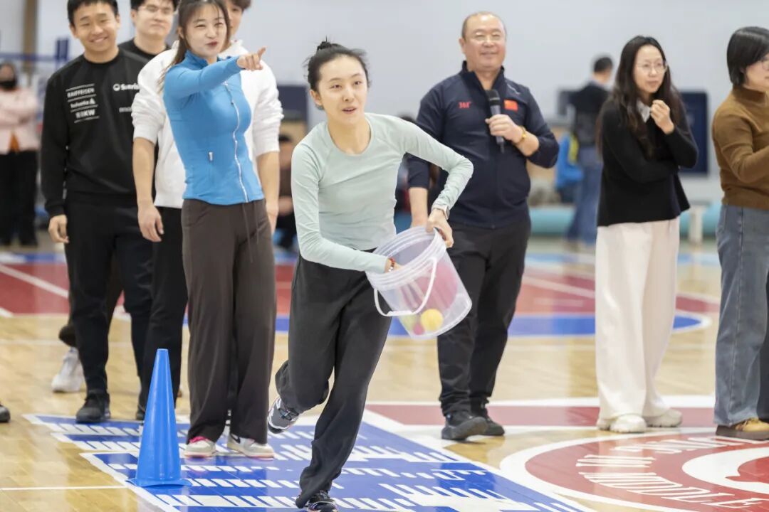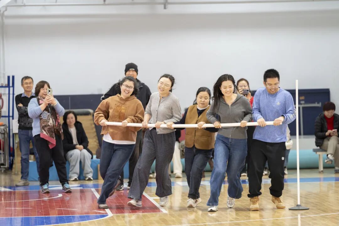 随后,教职工趣味运动会也在学校室内篮球馆火热举行。老师们积极参与各项趣味项目,现场笑声不断、气氛热烈。比赛不仅缓解了工作压力,也增强了教师团队的凝聚力和协作精神。