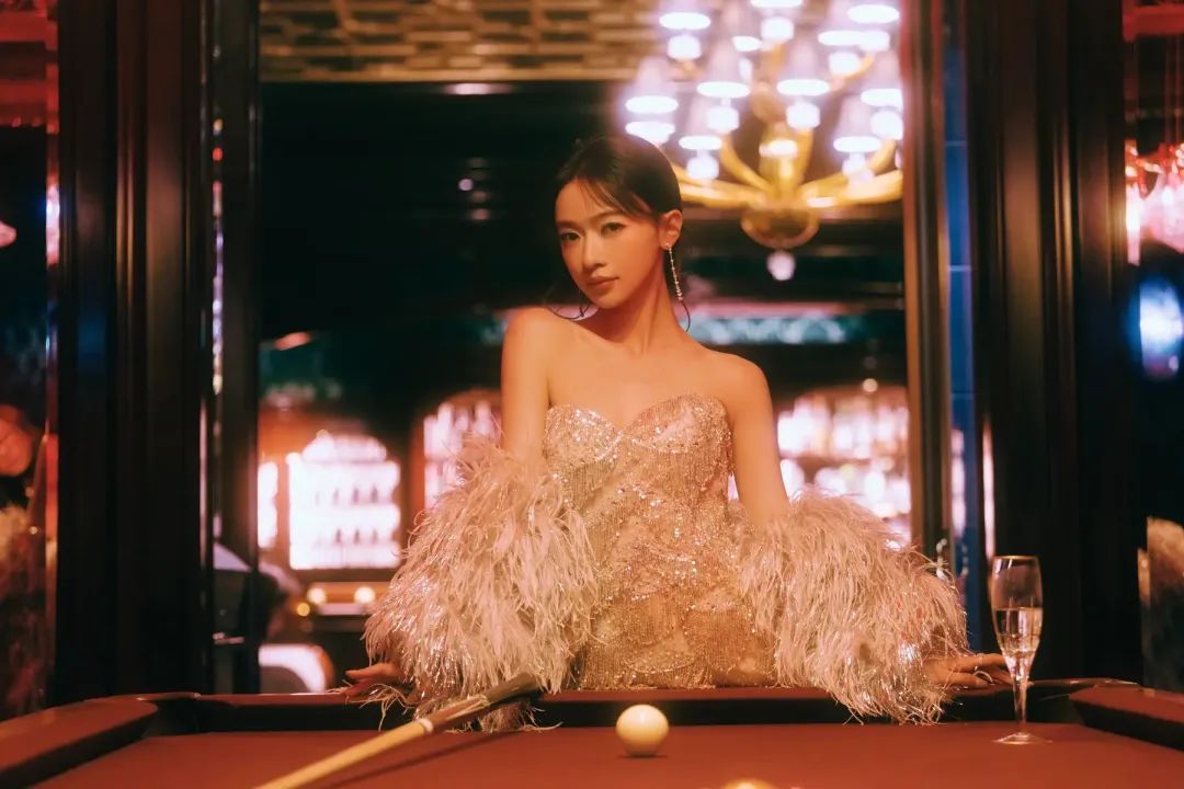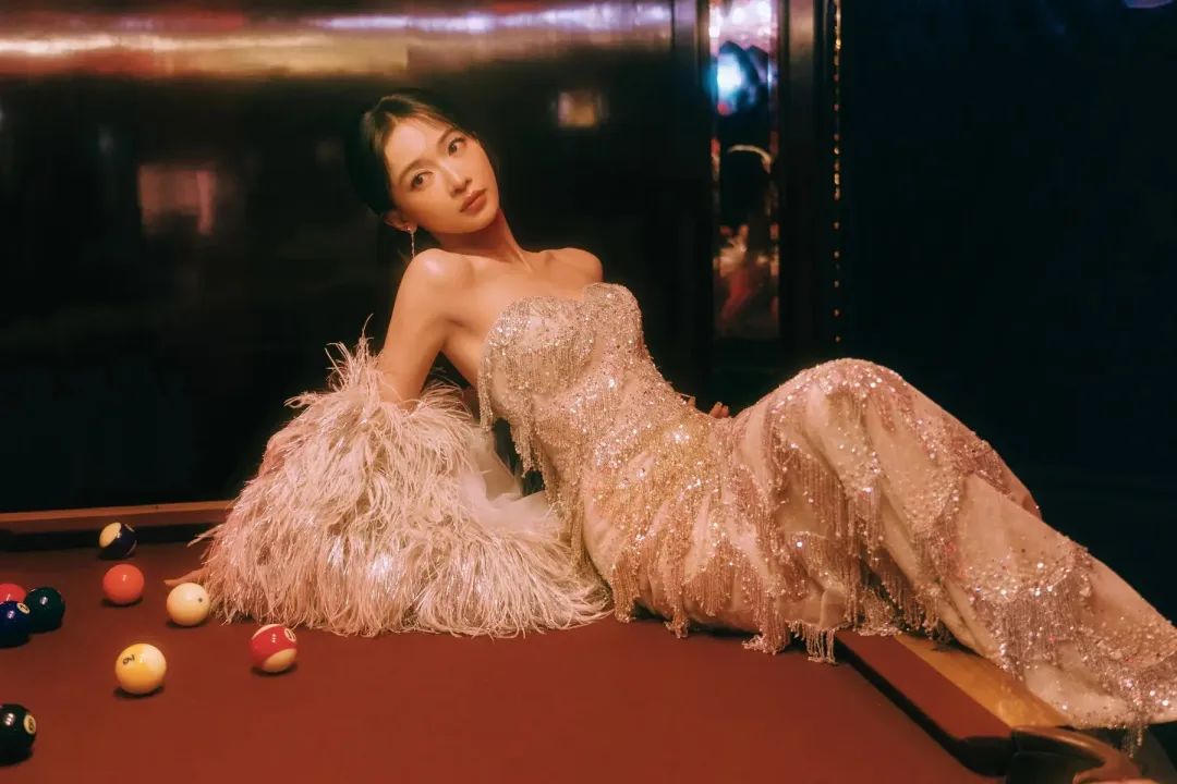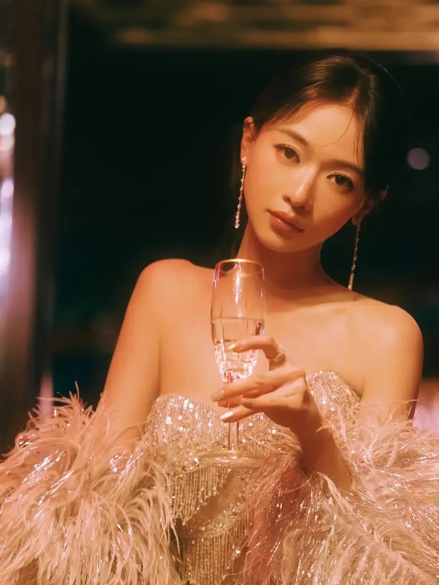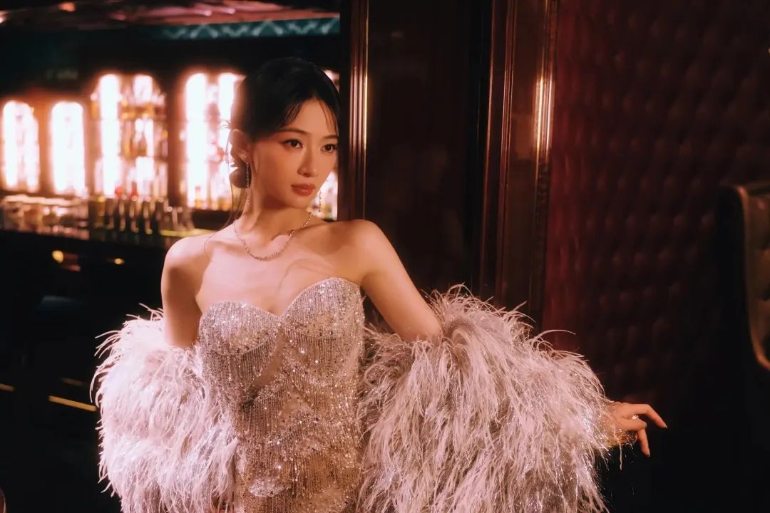 这身造型堪称完美。白色抹胸羽毛裙,纯净的底色衬得她肤如凝脂,抹胸设计大胆地展现出她精致的锁骨与优美的肩线,还勾勒出迷人的胸部曲线,性感与优雅完美平衡。裙身的羽毛层层叠叠,从腰部倾泻而下,灯光一打,每片羽毛都闪烁着柔和光泽,随着步伐轻轻摇曳,仿佛有了生命。搭配古典盘发,几缕碎发垂落,淡雅妆容突出眉眼深邃度,回眸瞬间仿佛古画美人动了。