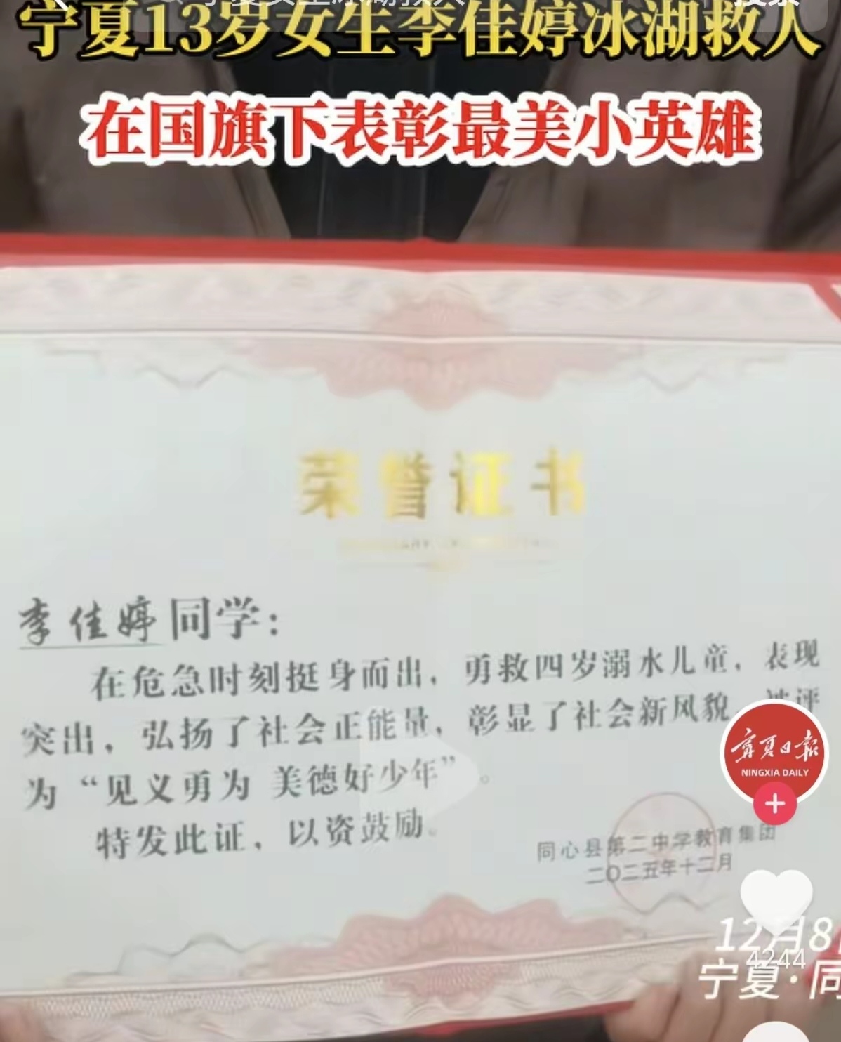 前两天,宁夏同心一位四岁男孩,一不小心掉进寒冷的冰窟下,极度危险,他的家人在施救的时候,因为薄冰家人也容易掉下去,这时在旁边路过的一位初中女孩李佳婷,危急时刻挺身而出,主动跟他的家人说她身子轻,让她过去救这个小孩!