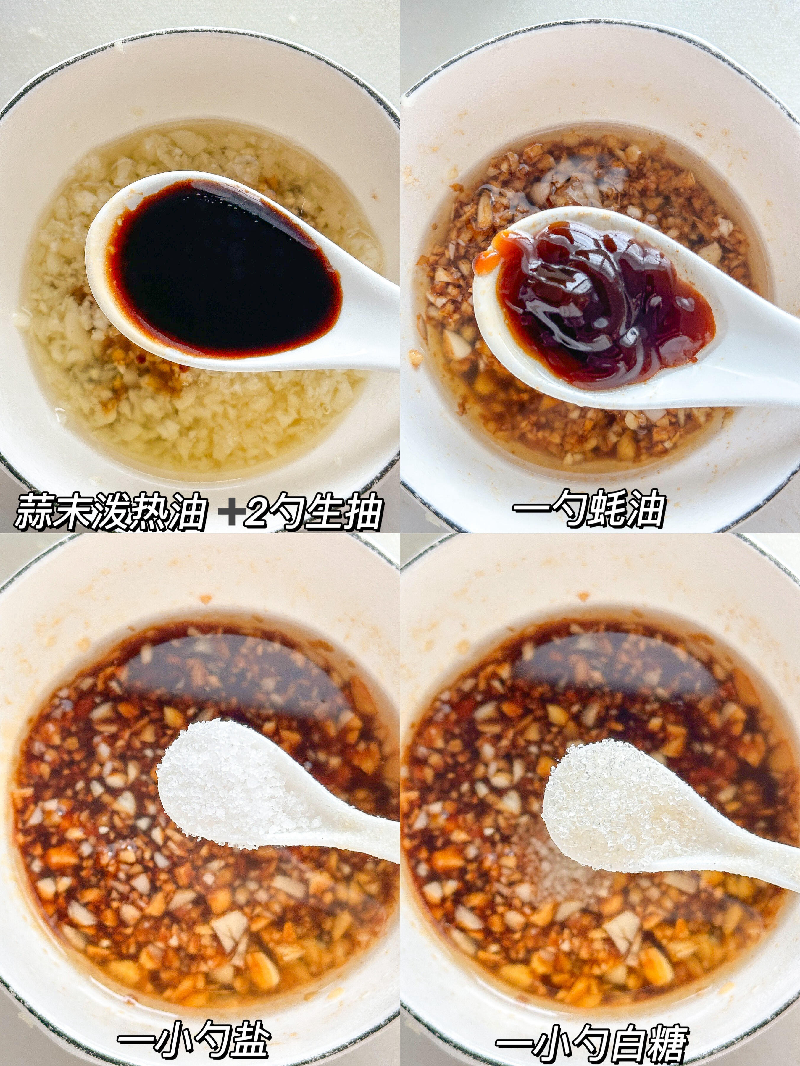 碗中放入炸好的金银蒜,加2勺生抽、1勺蚝油、1小勺盐、1小勺糖,重点来了!加3勺清水!这个稀释术能让酱汁均匀裹住食材。搅拌均匀后淋入1勺香油,瞬间香气四溢。