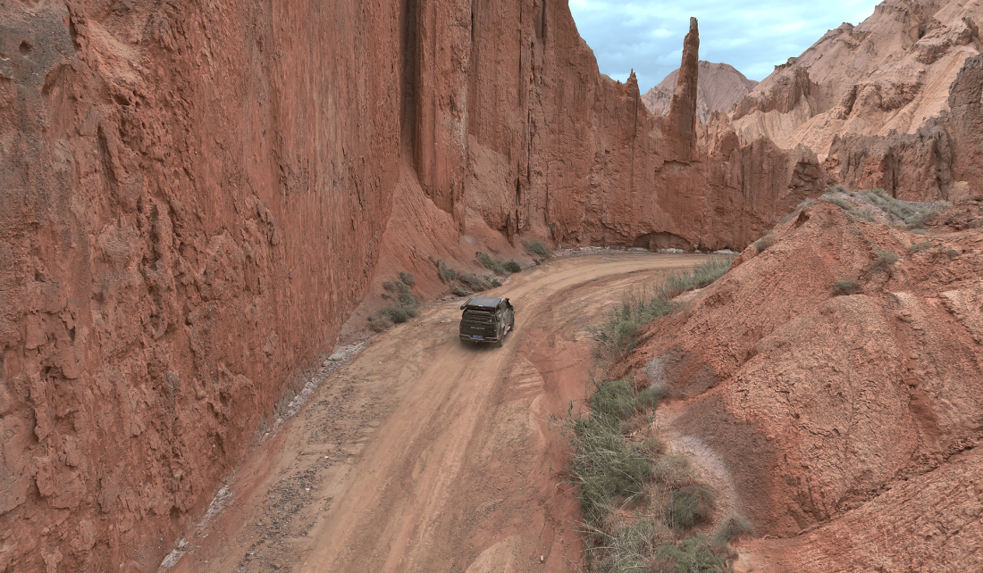 虽然独库公路沿途美景无数,但也少不了险峻与挑战。行驶至天山峡谷地段,道路两侧悬崖耸立,车轮仿佛在悬崖边上滑行,稍有不慎便会坠入深渊。然而在江铃大道敢探者的坚实操控下,这样的险路不仅没有削减驾驶的乐趣,反而增加了不少刺激感,心跳加速的同时,也更深刻地感受到它卓越的操控性能。无论是扎实的悬挂系统,还是经过苛刻测试的稳定性能,在这种极端环境中,江铃大道敢探者都交出了完美的答卷。