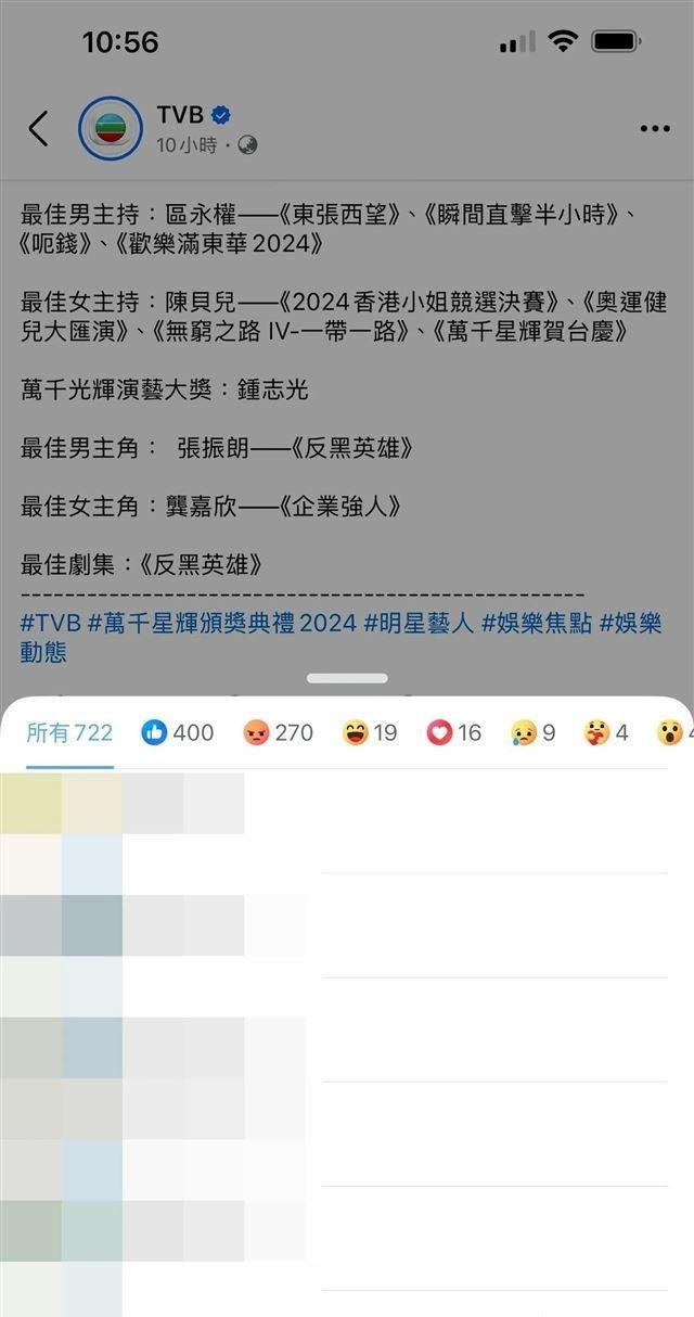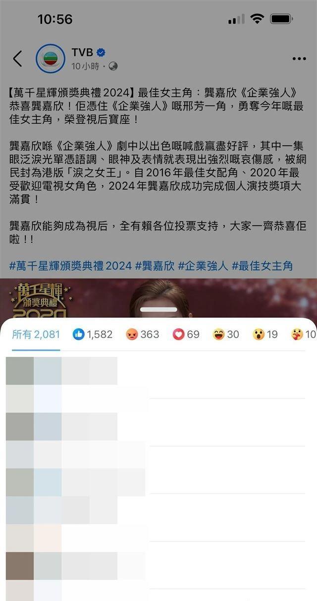 TVB官方社交账号与视后相关的帖子收到了超过2000个“发怒”表情,评论区里满是质疑声。