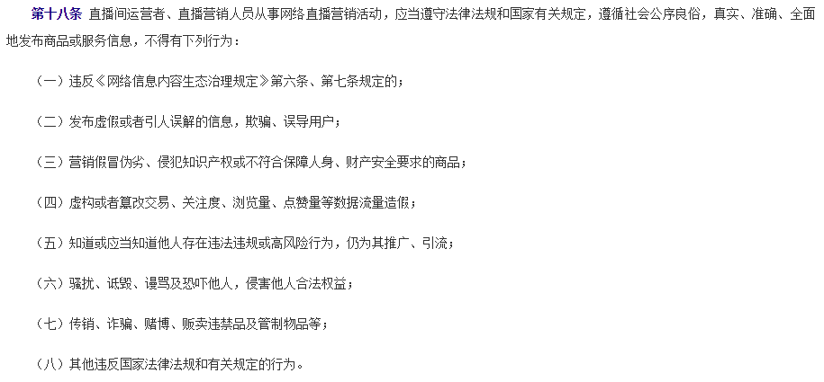 其中的8条红线主要就是针对主播和直播间运营人员,8条红线的内容包括:发布虚假或者引人误解的信息,欺骗、误导用户;营销假冒伪劣、侵犯知识产权或不符合保障人身、财产安全要求的商品;骚扰、诋毁、谩骂及恐吓他人,侵害他人合法权益;虚构或者篡改交易、关注度、浏览量、点赞量等数据流量造假;知道或应当知道他人存在违法违规或高风险行为,仍为其推广、引流等。