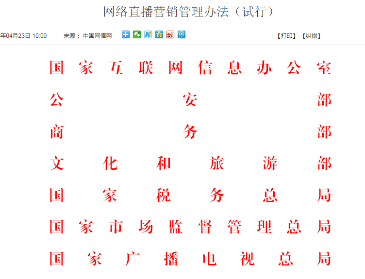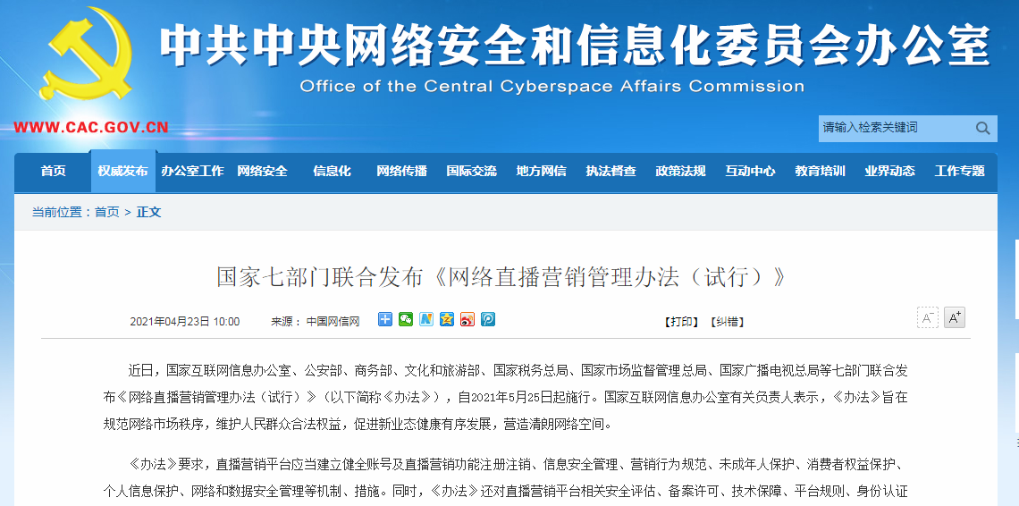 近日,国家互联网信息办公室、公安部、商务部、文化和旅游部、国家税务总局、国家市场监督管理总局、国家广播电视总局等七部门联合发布《网络直播营销管理办法(试行)》,自2021年5月25日起施行。
