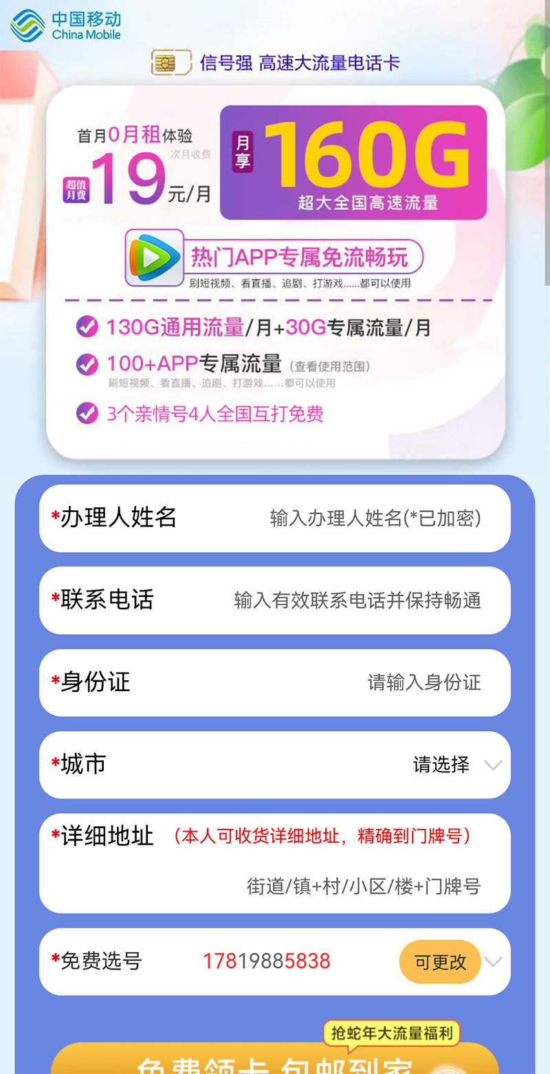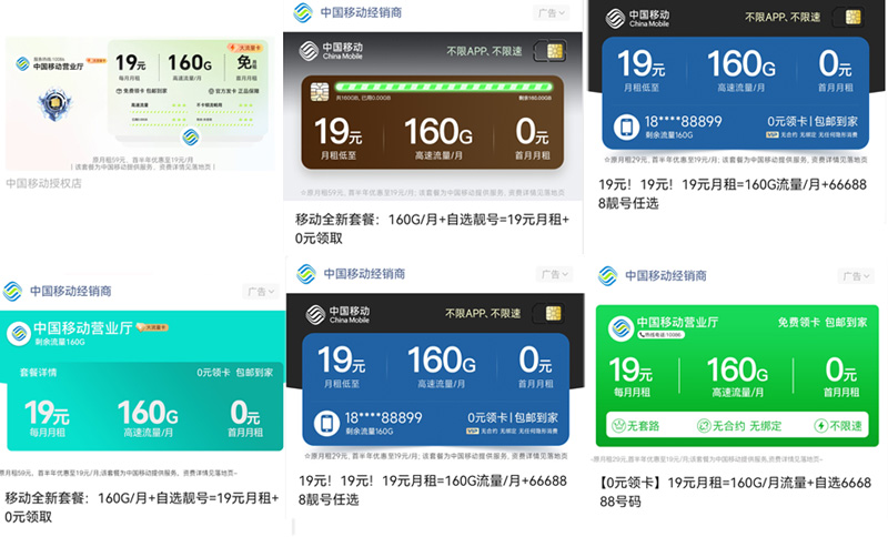 宣传产品:中国移动19元月租160G流量,可选号码。