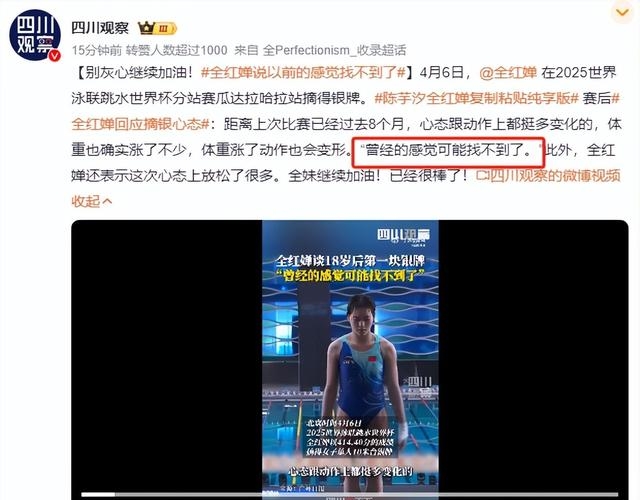 面对这样的结果,全红婵在赛后采访中表现得很平静。她坦言,过去 8 个月没有参加正式比赛,对比赛节奏有些生疏,体重增加也让动作变形。“曾经的感觉可能找不到了,现在需要重新适应。” 这句话让许多网友感到心疼,但也展现了她作为职业运动员的成熟和冷静。