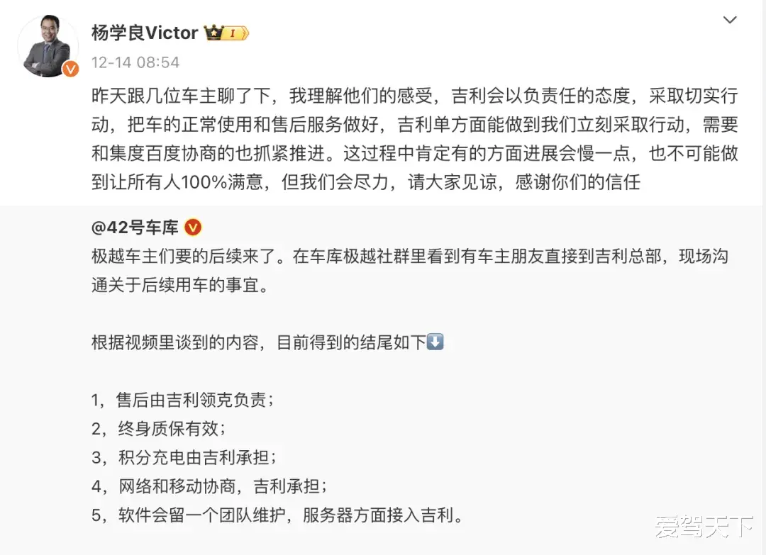 又有消息称,极越车主赴吉利总部进行沟通。12月14日,吉利控股高级副总裁杨学良表示,售后由领克负责,终身质保有效,积分充电、道路救援、网络(与移动协商后)及云端接入吉利等均由其承担,软件方面则与百度协商,若百度不维护吉利将承担。