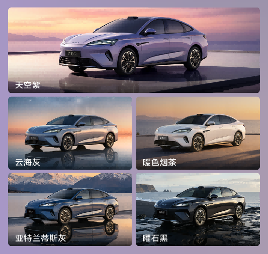 海豹07EV沿袭海洋美学设计,提供天空紫、云海灰、暖色烟茶、曜石黑、亚特兰蒂斯灰5款外观配色,让每一次出行都成为路上流动的风景。