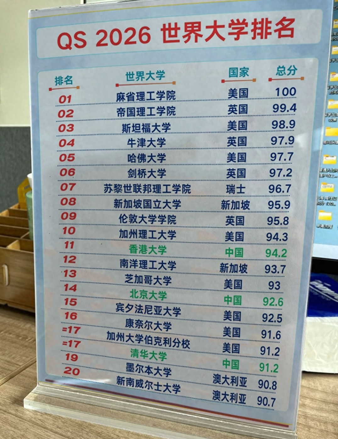 亚洲高校的亮眼表现,还体现在前二十名的榜单里。香港大学以94.2分位列第十一位,南洋理工大学紧随其后排名第十二,北京大学、清华大学则分别以92.6分、91.2分位列第十四和第十七位。值得注意的是,清华大学与加州大学伯克利分校原本并列第十七位,却在部分非官方榜单中被错误标注为第十九位,这也提醒着大家,看待排名需以官方数据为准。