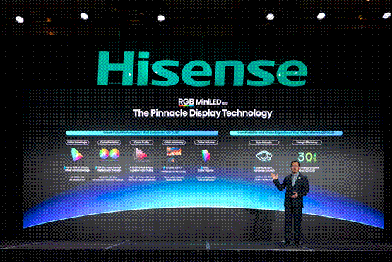 为了打破传统Mini LED和OLED的色彩、能耗及视觉舒适局限,进一步提升大屏时代显示设备的用户体验,海信一年前开创并全球最先量产了RGB-Mini LED电视,这一创新技术随着全球TOP5电视品牌悉数布局,迅速成为全球高端电视的趋势热词。“RGB与Mini LED的结合,是一场颠覆性的变革。”海信视像科技总裁李炜在今年CES的展前发布会上表示,为了还原那份无限趋近于肉眼所见的极致真实,全新一代RGB-Mini LED技术带来了三大进化。