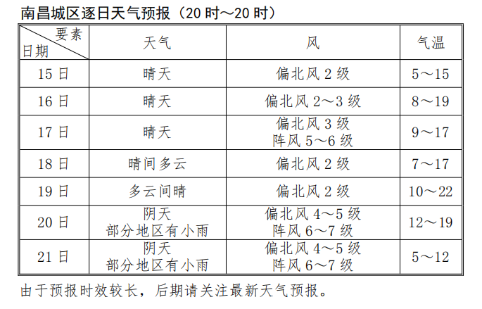 预计,我市本周工作日天气总体晴好,周末(20-21日)有一次较强冷空气降温、大风、弱降水过程。其中,15-16日晴天;17日受弱干冷空气影响,晴天,偏北阵风5~6级,气温略有下降;18日晴天多云;19日多云间晴;20-21日偏北阵风加大至6~7级,平均气温下降6℃左右,阴天部分地区有小雨。