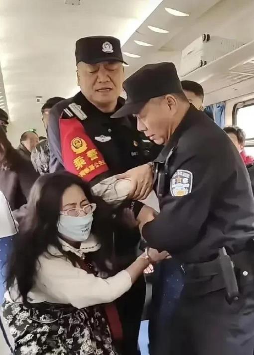 她这行为已经不仅仅是扰乱公共秩序这么简单了,直接上升到袭警了,乘警也不再忍受,直接将她制服,并铐上了手铐,期间老人还想要解救她的女儿,可也无济于事。