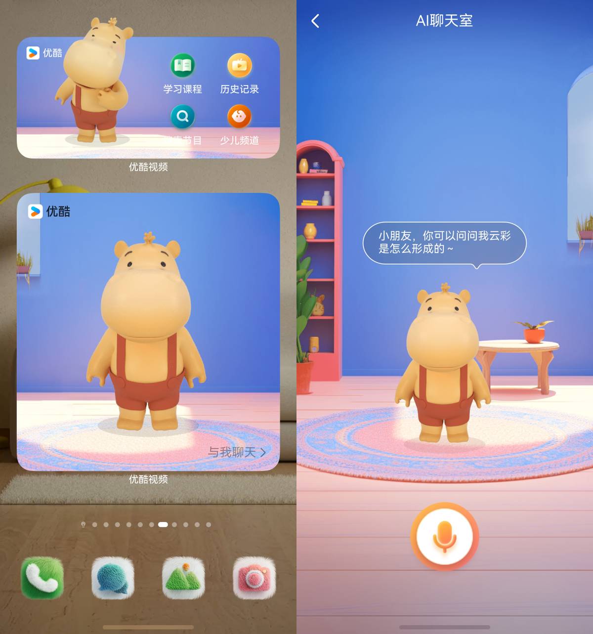还有我常用来追剧的鸿蒙版优酷视频。它的互动卡片上有一只3D河马,特别呆萌。而且只要轻轻点它一下,它就会跳一跳、挥挥手,还会跟我说句话,有点像电子宠物。点右下角的聊天按钮,就直接跳转到少儿频道的“陪伴”功能,我家孩子可喜欢这个了,现在动不动就吵着要和“河马”语音聊天。