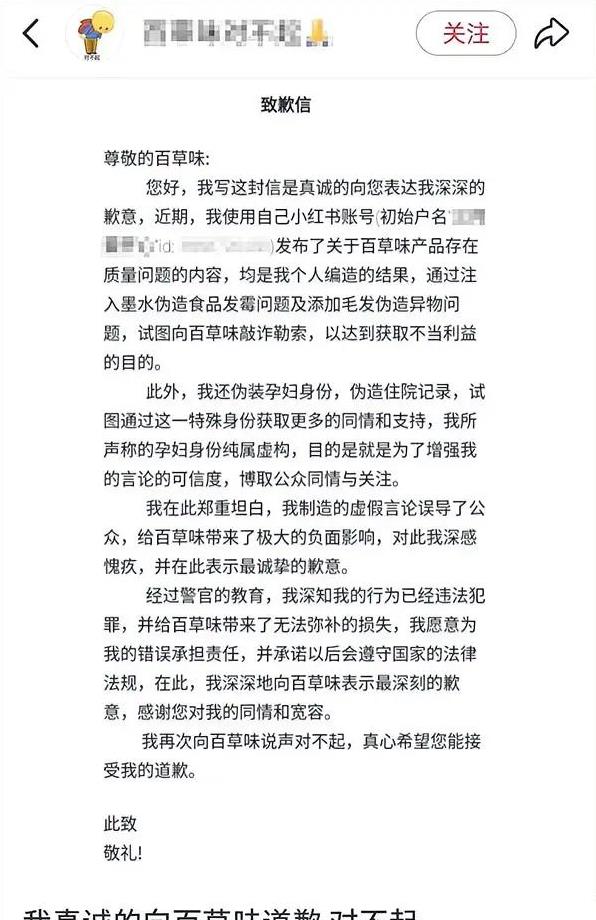 就在大家对这起事件充满关切的时候,12月14日,涉事消费者发布了一封《致歉信》,引起了市场的震动。信中坦承,之前关于百草味产品存在质量问题的内容,全都是她个人编造的虚假消息。她甚至自曝,通过注入墨水伪造了食品发霉的问题,并添加毛发来制造异物证据,目的竟然是想要向百草味敲诈勒索,以谋取不当利益!