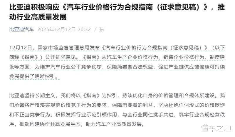 12月12日,比亚迪在官方公众号发文表示,国家市场监督管理总局12月12日发布《汽车行业价格行为合规指南(征求意见稿)》(以下简称《指南》)公开征求意见。《指南》从汽车生产企业价格行为、销售企业价格行为、制度建设等方面,为维护汽车行业公平竞争秩序,保障消费者合法权益,促进产业链供应链健康可持续发展提供了明晰指引。