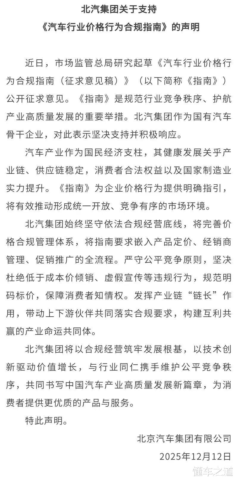 12月12日,北汽集团在官方公众号发布了关于支持《汽车行业价格行为合规指南》的声明。北汽集团表示,近日,市场监管总局研究起草《汽车行业价格行为合规指南(征求意见稿)》(以下简称《指南》)公开征求意见。《指南》是规范行业竞争秩序、护航产业高质量发展的重要举措。北汽集团作为国有汽车骨干企业,对此表示坚决支持并积极响应。