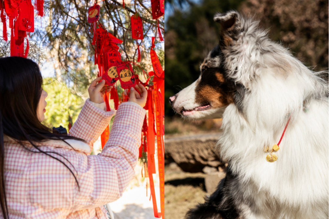 活动现场家长为毛孩子挂“许愿牌”(左)和佩戴“长命锁”的毛孩子(右)