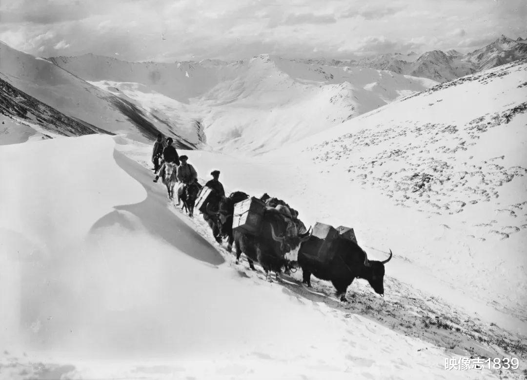 贡嘎雪山上的茶马古道,遇到雪天行走极为困难,要靠牦牛队来运送各种商品。