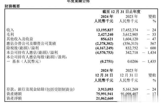 3、公司持有人应占亏损为45.71亿元,同比下降了1434%,由盈转亏;