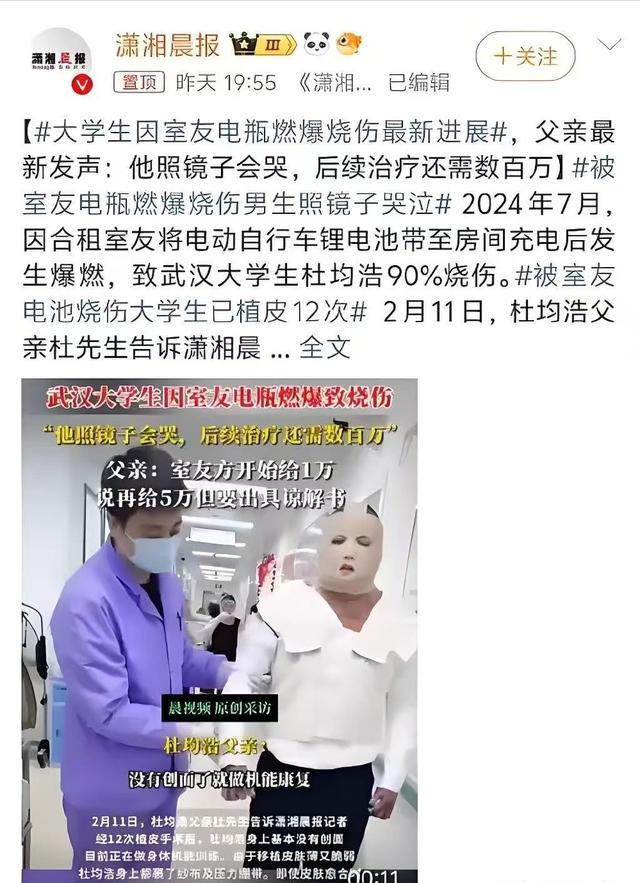 潇湘晨报:2025-02-11《武汉大学生因室友电瓶燃爆致烧伤,父亲最新发声:他照镜子会哭,后续治疗还需数百万》