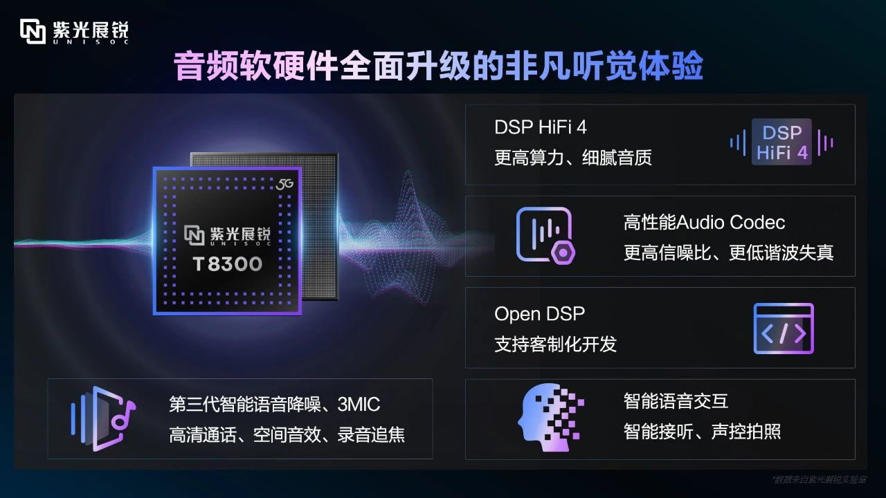 紫光展锐T8300采用全新的音频架构,AudioCodec性能大幅提升,为用户带来更加纯净、真实的音质体验。同时,紫光展锐T8300首次搭载Hi-Fi4,提供Hi-Fi级音质享受,让用户声临其境沉醉其中。
