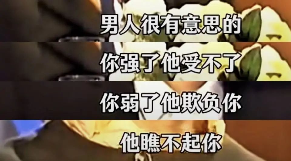 她曾在一次采访中说,男人很有意思,你强了他受不了,你弱了他欺负你,他看不起你。