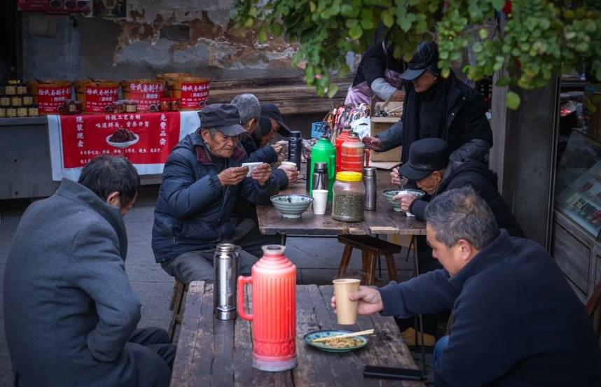 随着太阳探出头,街上渐渐热闹起来。街道上,此起彼伏的打招呼声,油锅的“滋滋”声,面团与面板碰撞的“砰砰”声,还有滚烫热水冲入茶杯的“簌簌”声等交织在一起,即便不用鼻子,仅用耳朵聆听就能真切地感受到这浓厚的烟火气息。在街上踱步,茶香、酥饼香、酱香、酒香……各种香味层层叠叠,依次钻进鼻腔。这一千三百年来,古镇里的人换了一茬又一茬,可这热闹的景象,却仍保留在街巷间、轮廓里,更融入到了早茶习俗之中。