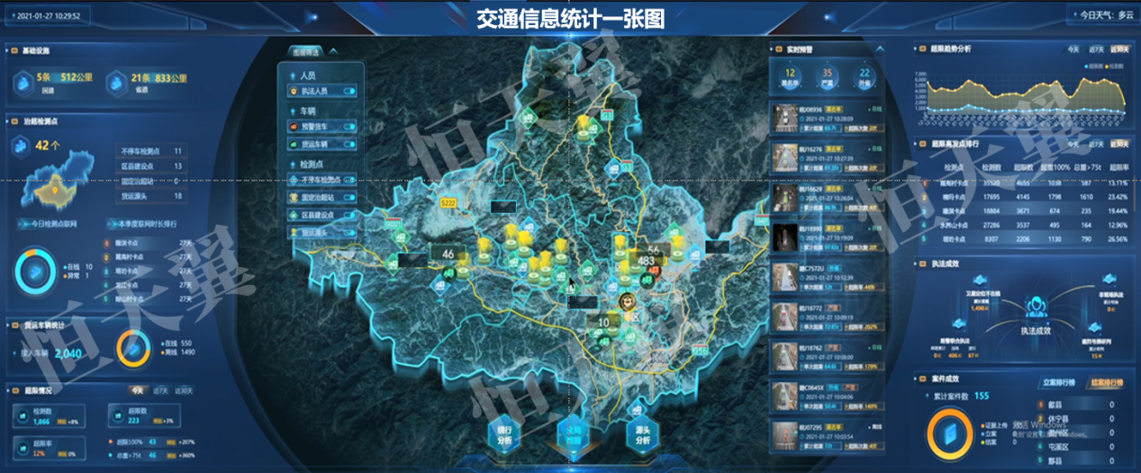 科技治超,精准高效恒天翼智慧运输监管平台利用先进的物联网技术和大数据分析,实现对车辆载重的实时监测与预警。超限超载车辆一旦进入监管区域,电子围栏立即发出警报,平台能够迅速识别并记录超载行为,及时向管理部门发送警报,有效遏制了超载运输的蔓延趋势。同时,平台还具备历史数据分析功能,为制定更为科学合理的超限超载治理政策提供了数据支持。