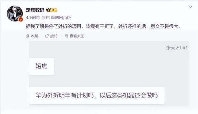 有网友询问,华为的外折叠屏手机还会不会有新机推出。得到的答复是,华为外折叠屏手机项目已经停了,而原因就是有了三折叠屏手机了,所以外折叠屏手机继续研发的意义不大了。