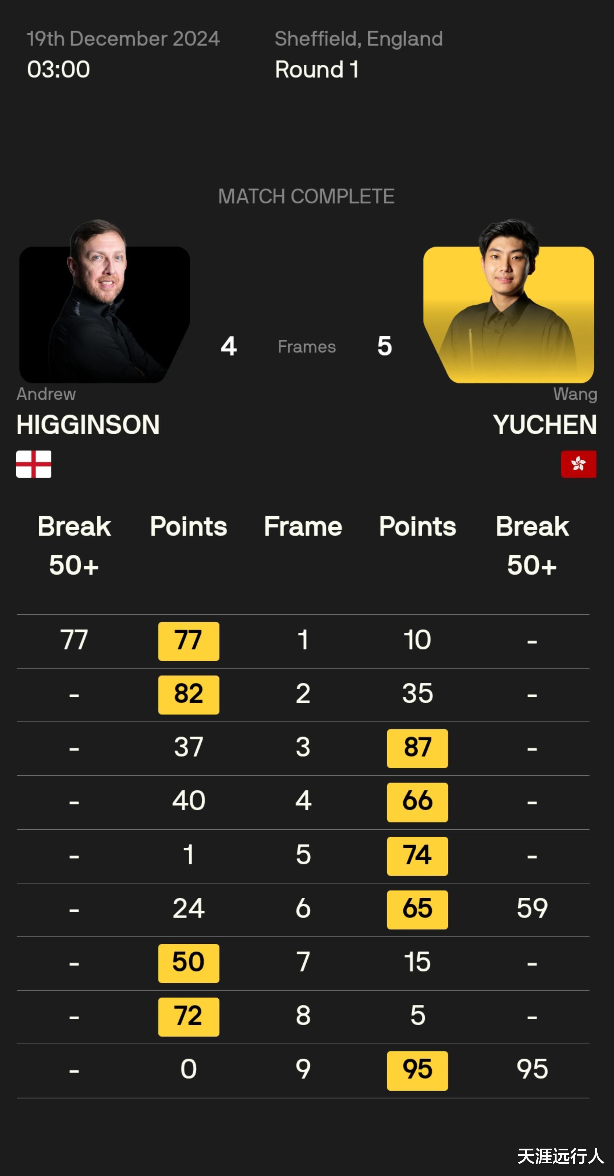 全场比赛王雨晨打出59、95分两杆50+,安德鲁·希金森打出一杆单杆77分,双方战至决胜局,王雨晨以5-4战胜安德鲁·希金森,晋级96强。