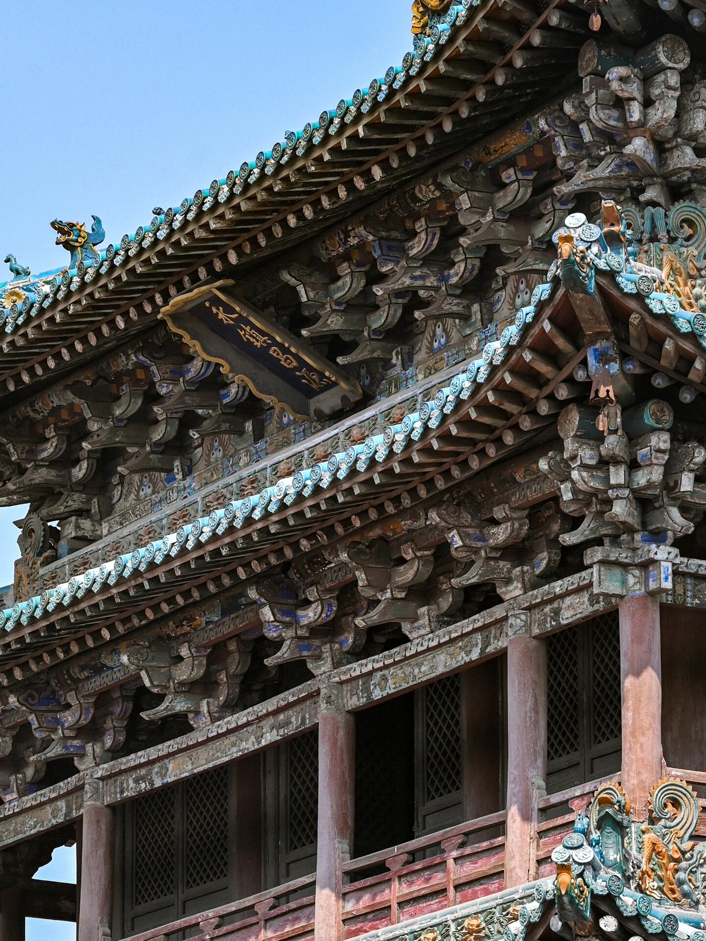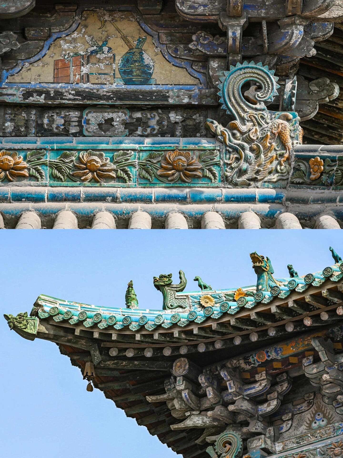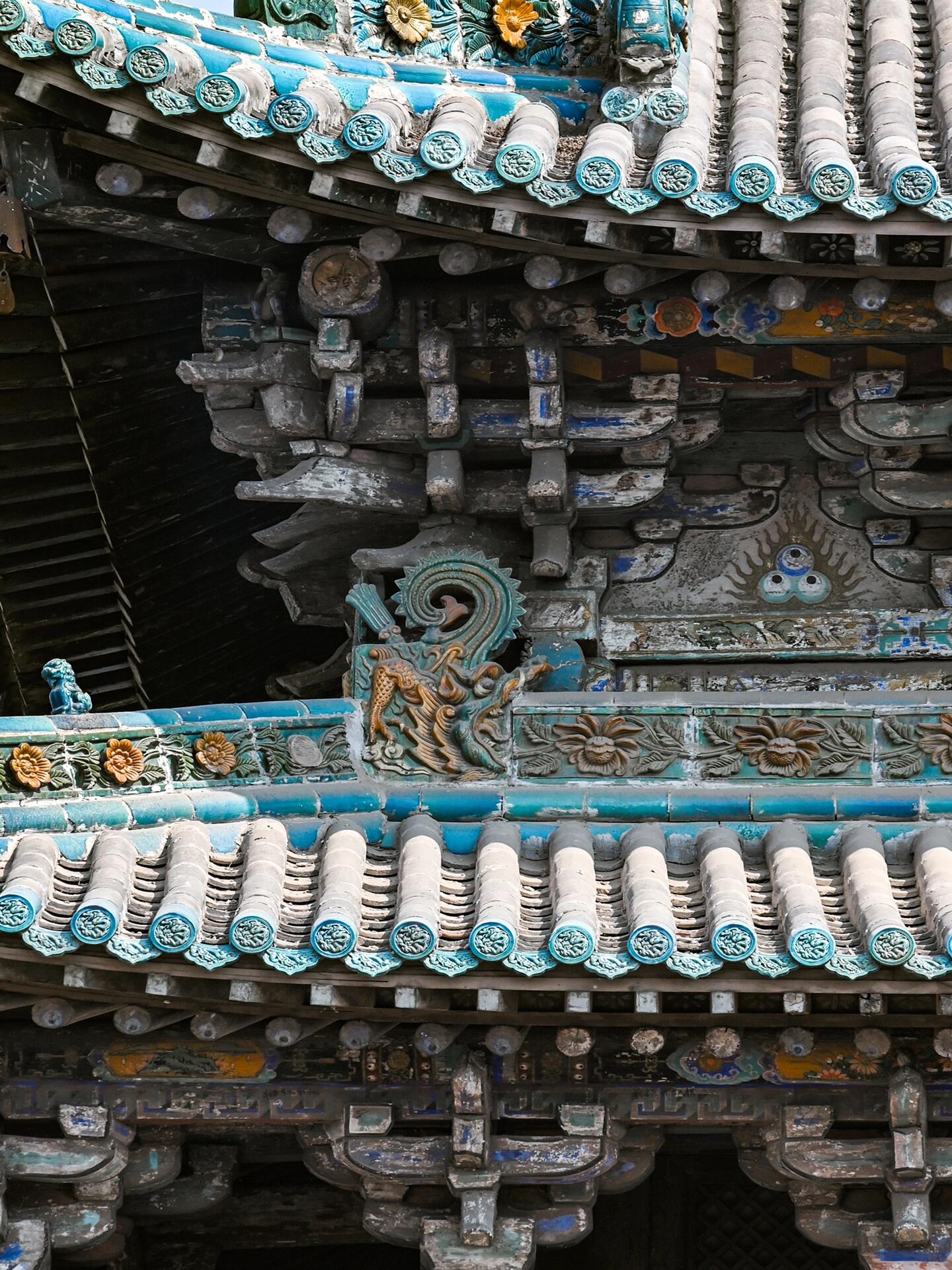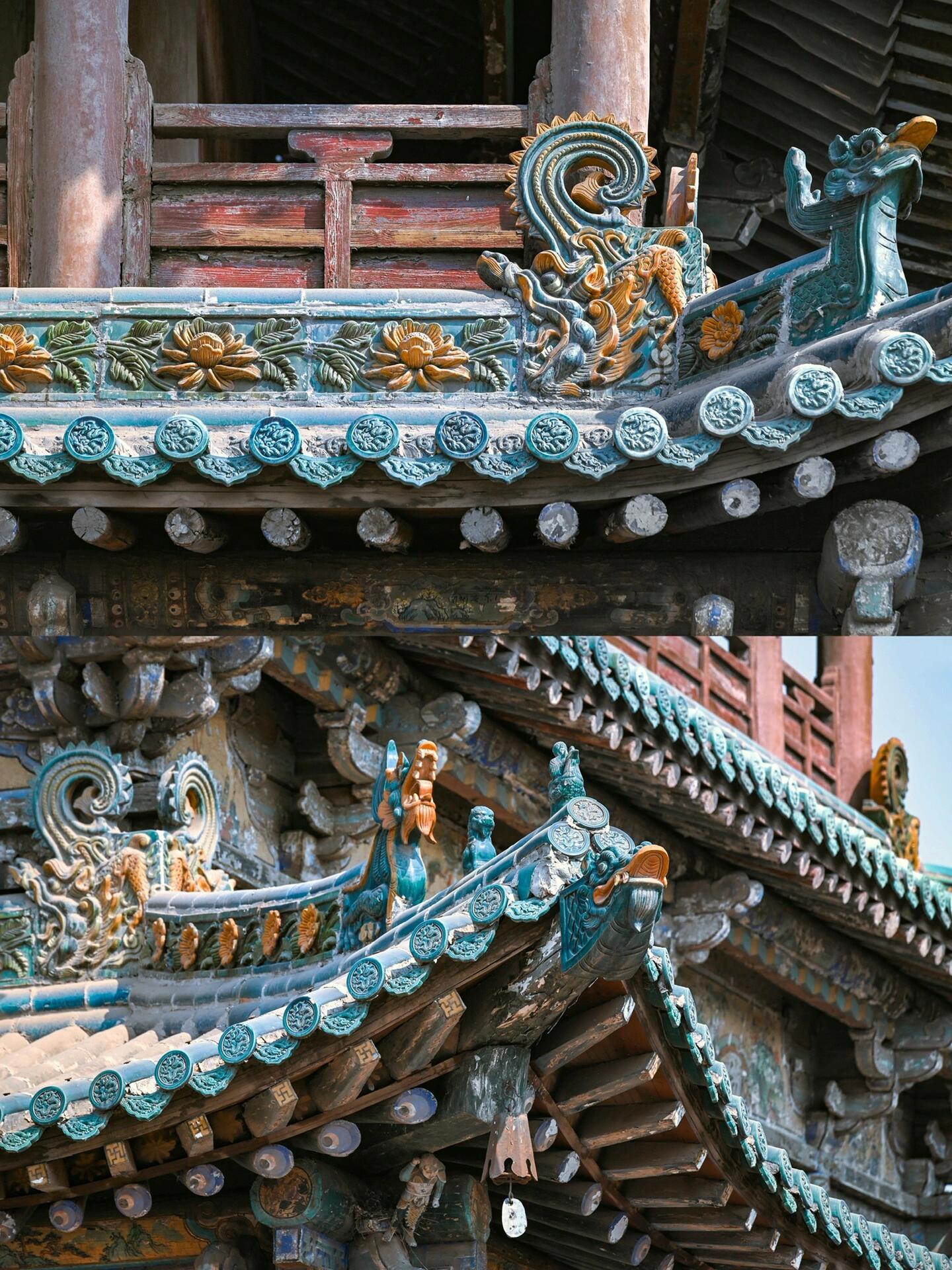 谁能想到,六百年前明宣德年间的匠人砌下第一块砖石时,心里想的或许只是"镇住"村外那条喜怒无常的昌源河。半米厚的砖石台基往土里扎得扎实,像给河流按了道无形的闸门,可工匠们偏又在严肃的功能性上,撒了把艺术的野。你凑近了看那些梁架间的彩画,青绿色的旋子纹里藏着暗八仙的纹样,墨线勾得比江南绣娘的针脚还细,可转脸看檐角的琉璃走兽,又是浓墨重彩的张扬,龙首鱼身的螭吻张着嘴吞住正脊,尾巴翘得能扫到天上的流云。这种矛盾的精致,就像晋商票号的掌柜,账房里算盘打得比谁都精,转身在戏楼里听《打金枝》时,眼角的泪比谁都真。