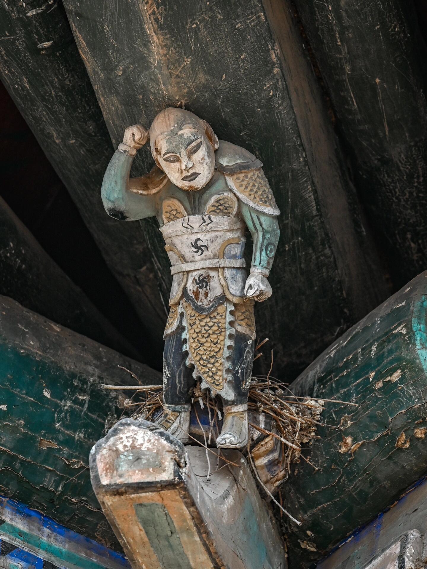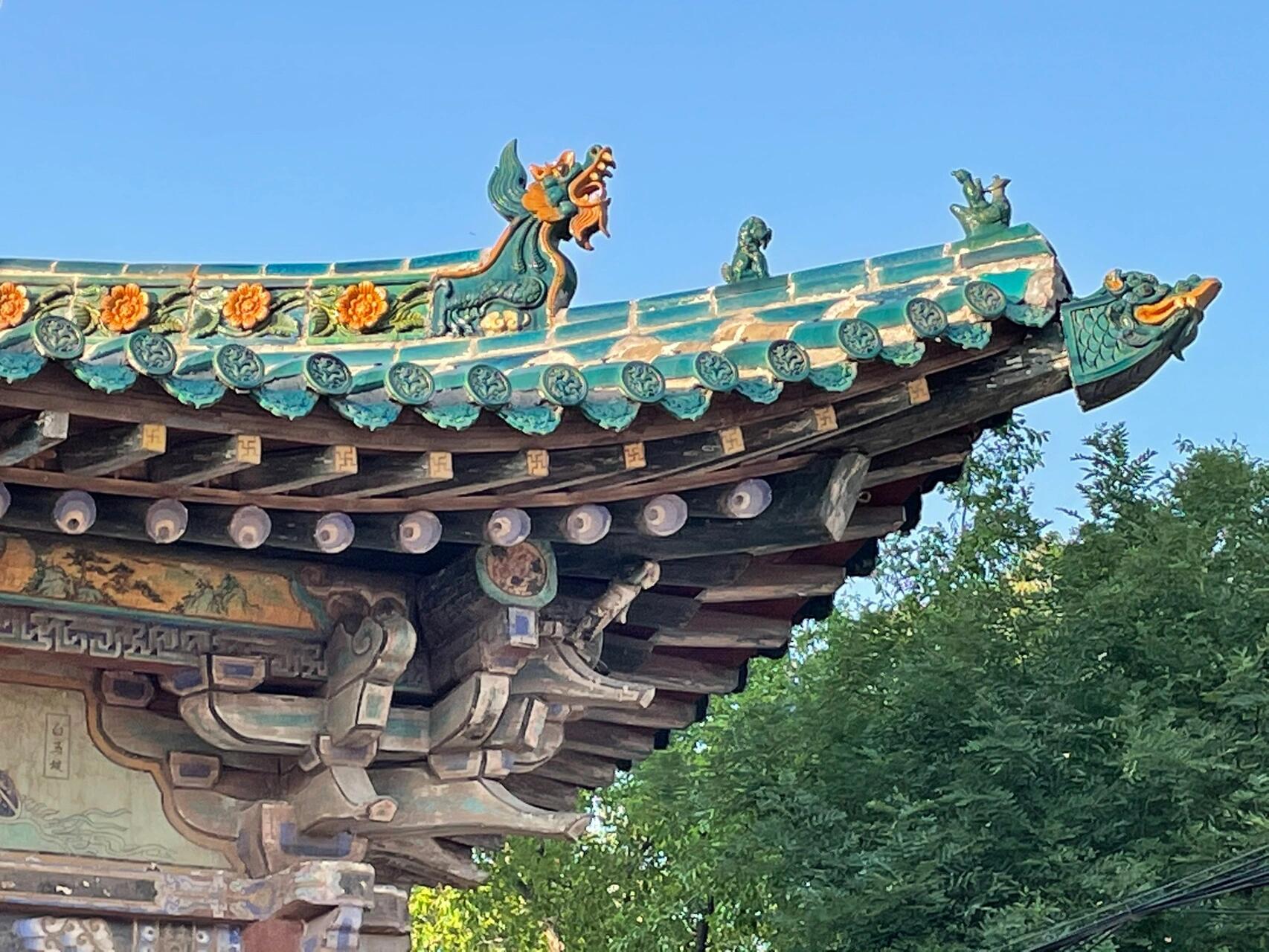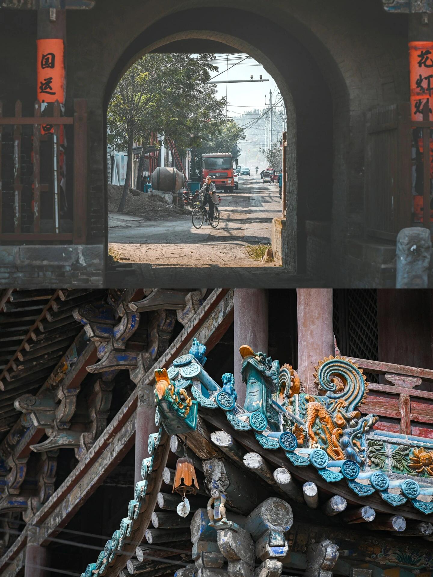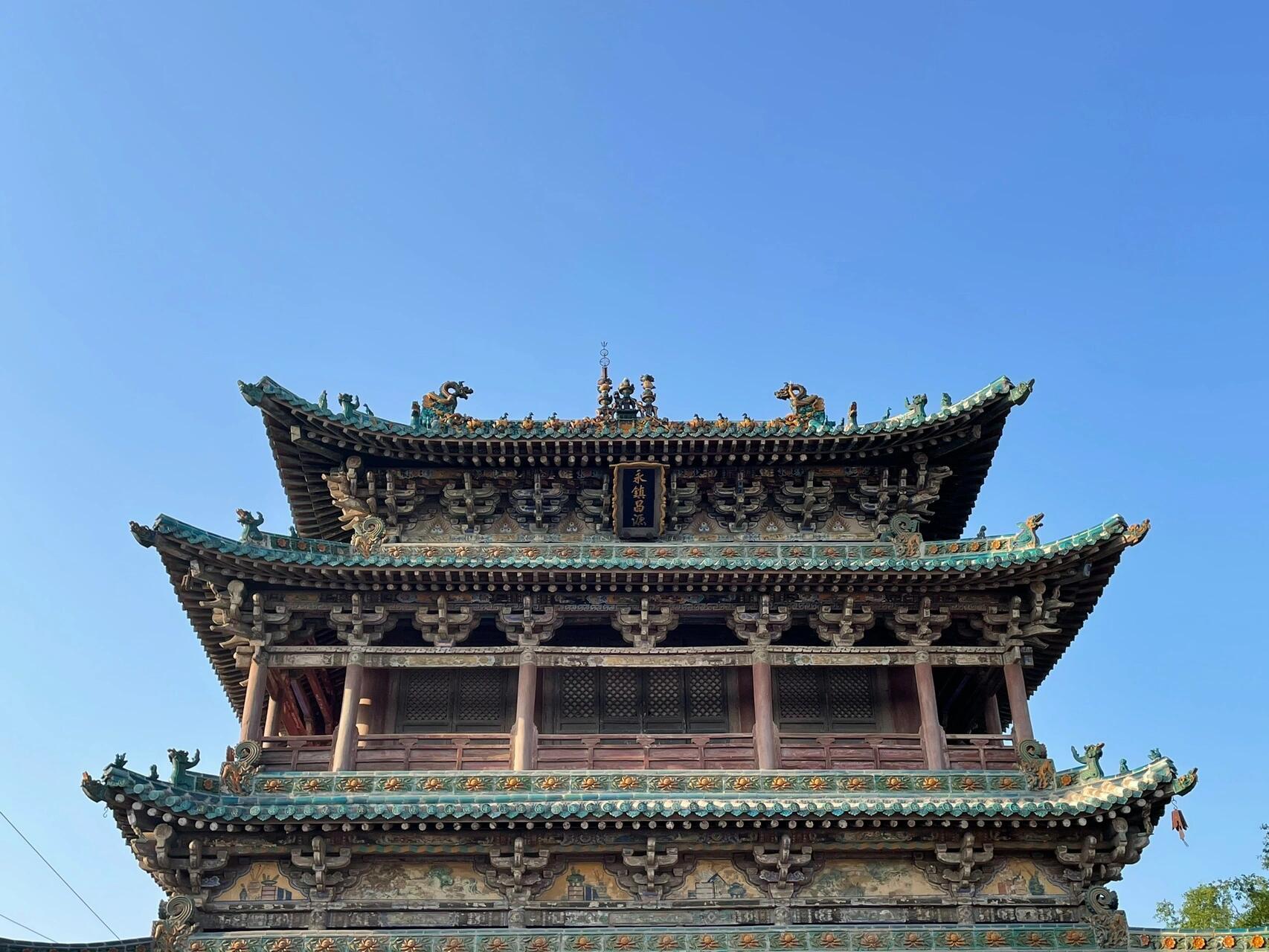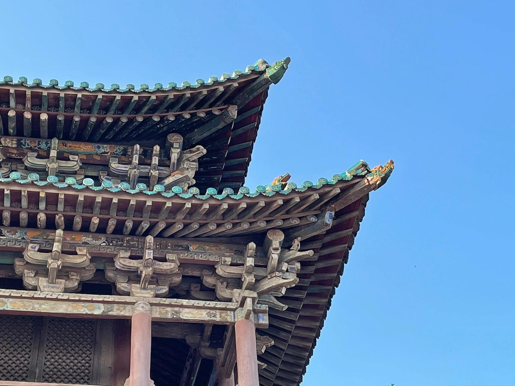 谁能想到,六百年前明宣德年间的匠人砌下第一块砖石时,心里想的或许只是"镇住"村外那条喜怒无常的昌源河。半米厚的砖石台基往土里扎得扎实,像给河流按了道无形的闸门,可工匠们偏又在严肃的功能性上,撒了把艺术的野。你凑近了看那些梁架间的彩画,青绿色的旋子纹里藏着暗八仙的纹样,墨线勾得比江南绣娘的针脚还细,可转脸看檐角的琉璃走兽,又是浓墨重彩的张扬,龙首鱼身的螭吻张着嘴吞住正脊,尾巴翘得能扫到天上的流云。这种矛盾的精致,就像晋商票号的掌柜,账房里算盘打得比谁都精,转身在戏楼里听《打金枝》时,眼角的泪比谁都真。