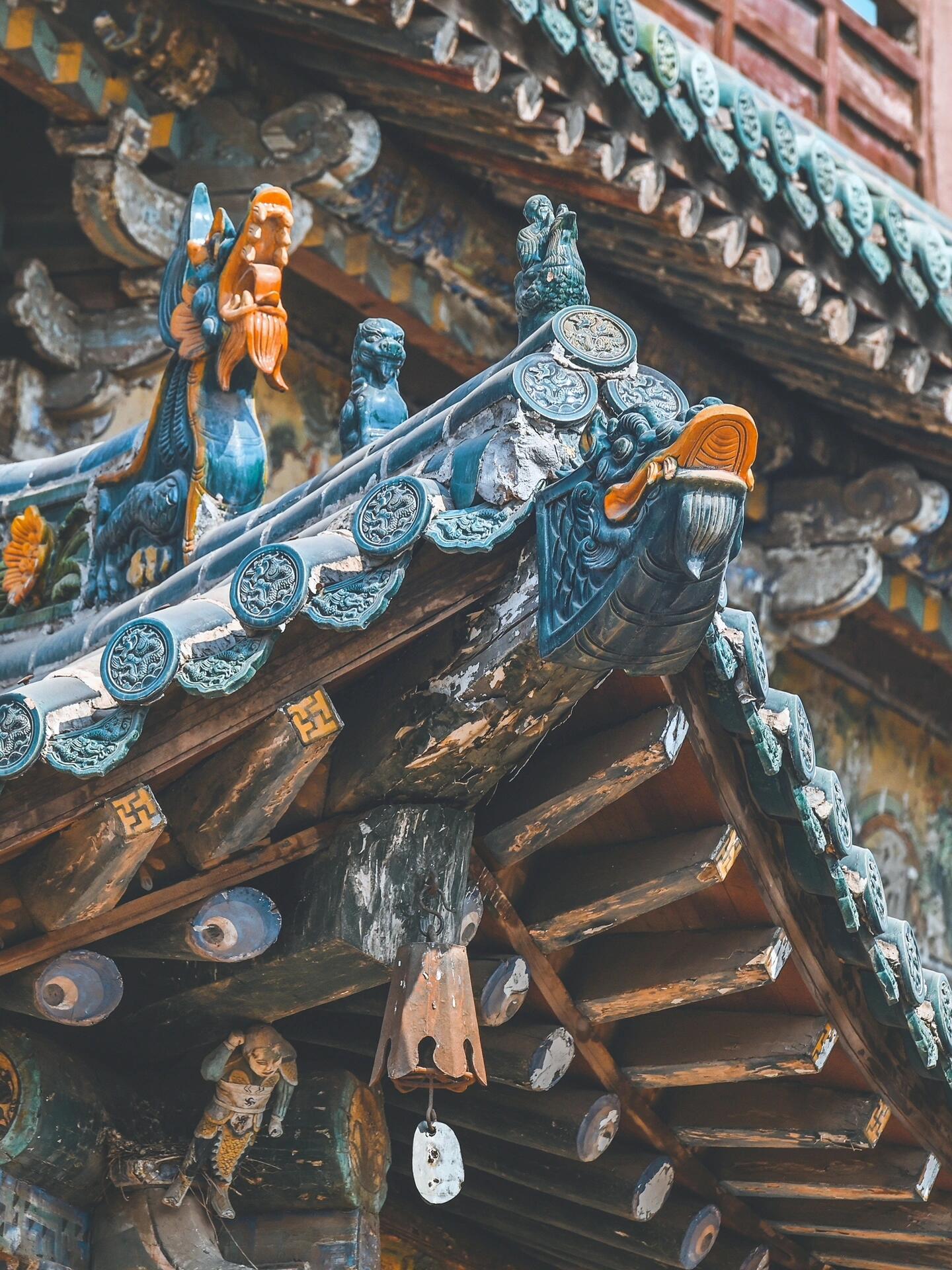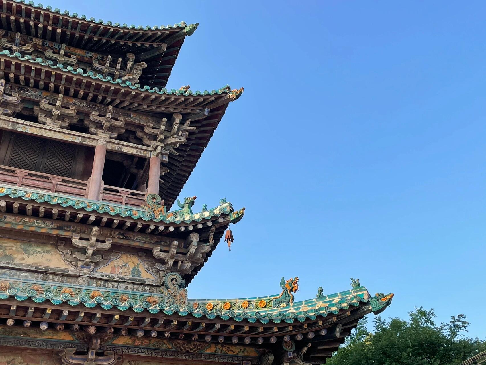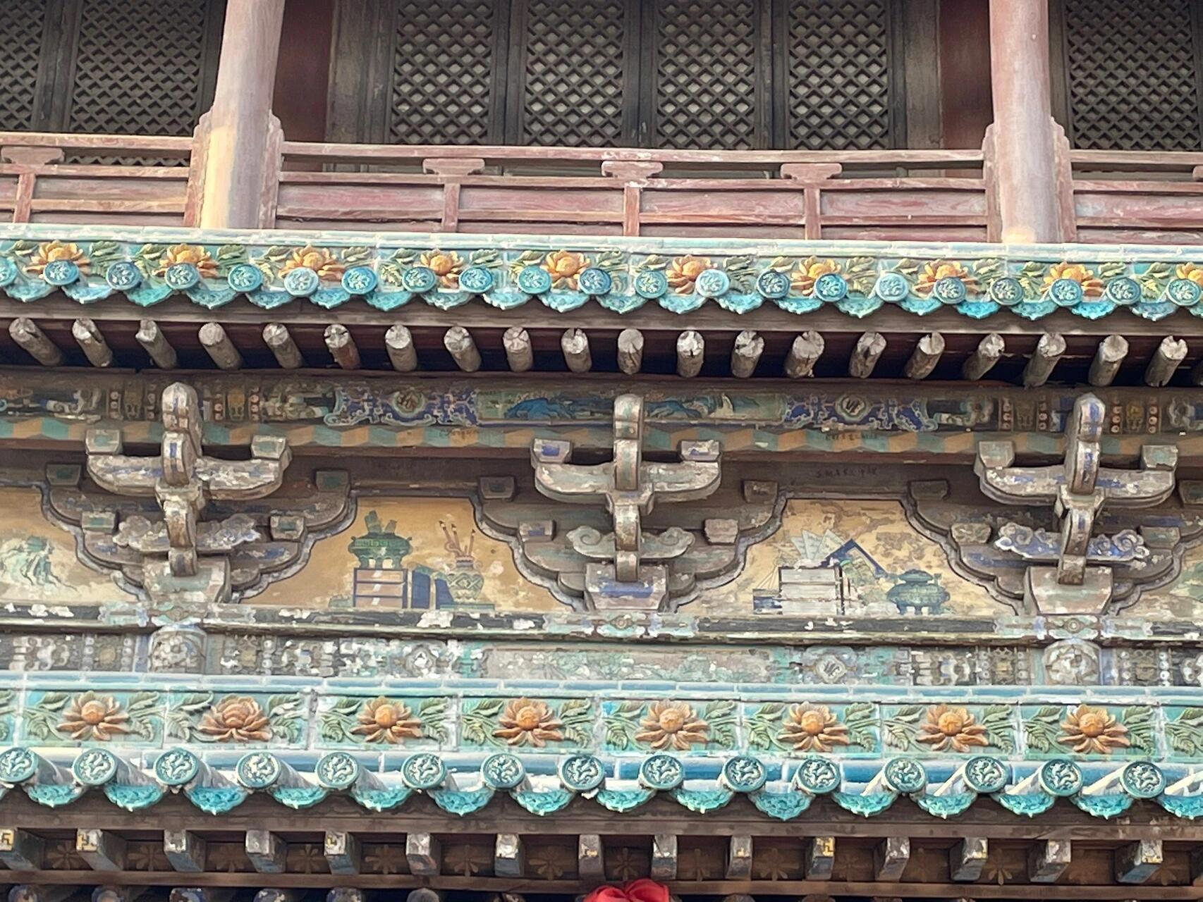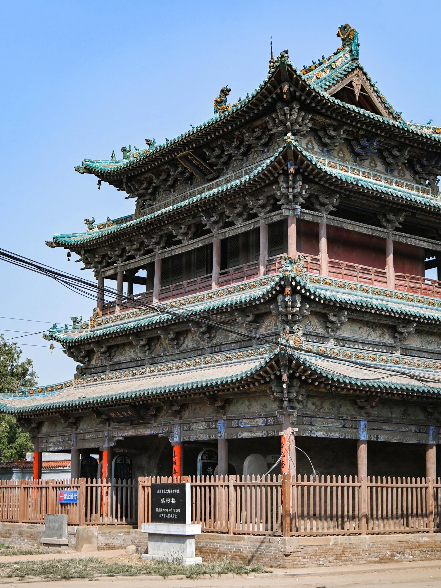 谁能想到,六百年前明宣德年间的匠人砌下第一块砖石时,心里想的或许只是"镇住"村外那条喜怒无常的昌源河。半米厚的砖石台基往土里扎得扎实,像给河流按了道无形的闸门,可工匠们偏又在严肃的功能性上,撒了把艺术的野。你凑近了看那些梁架间的彩画,青绿色的旋子纹里藏着暗八仙的纹样,墨线勾得比江南绣娘的针脚还细,可转脸看檐角的琉璃走兽,又是浓墨重彩的张扬,龙首鱼身的螭吻张着嘴吞住正脊,尾巴翘得能扫到天上的流云。这种矛盾的精致,就像晋商票号的掌柜,账房里算盘打得比谁都精,转身在戏楼里听《打金枝》时,眼角的泪比谁都真。