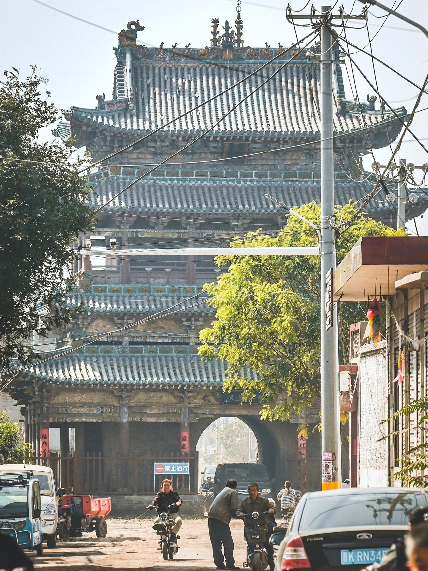 这话倒是说到了点子上。镇河楼最绝的不是琉璃瓦有多亮,而是它把一座楼活成了一段路的纪念碑。你站在券洞里抬头看,能看见四重天井像被切开的蛋糕,每层檐角都对着不同的方向——东檐角指的是祁县老城的方向,西檐角对着吕梁山脉的轮廓,南来的商队从南檐下进来时,能看见砖雕上"紫气东来"的字样,北往的旅人抬头,又能瞅见"北通燕赵"的石刻。六百年里,多少骆驼队从楼下走过,驼铃在券洞里撞出的回声,怕是比佛经里的箴言还灵验。可现在呢?京陕古道早就被高速路截成了碎段,楼前那条路只剩下半米宽的土路,雨天泥泞,晴天扬尘,去年有个骑摩托车的小伙子想从券洞里穿过去,结果车把挂住了檐下的铁马,摔了个嘴啃泥。