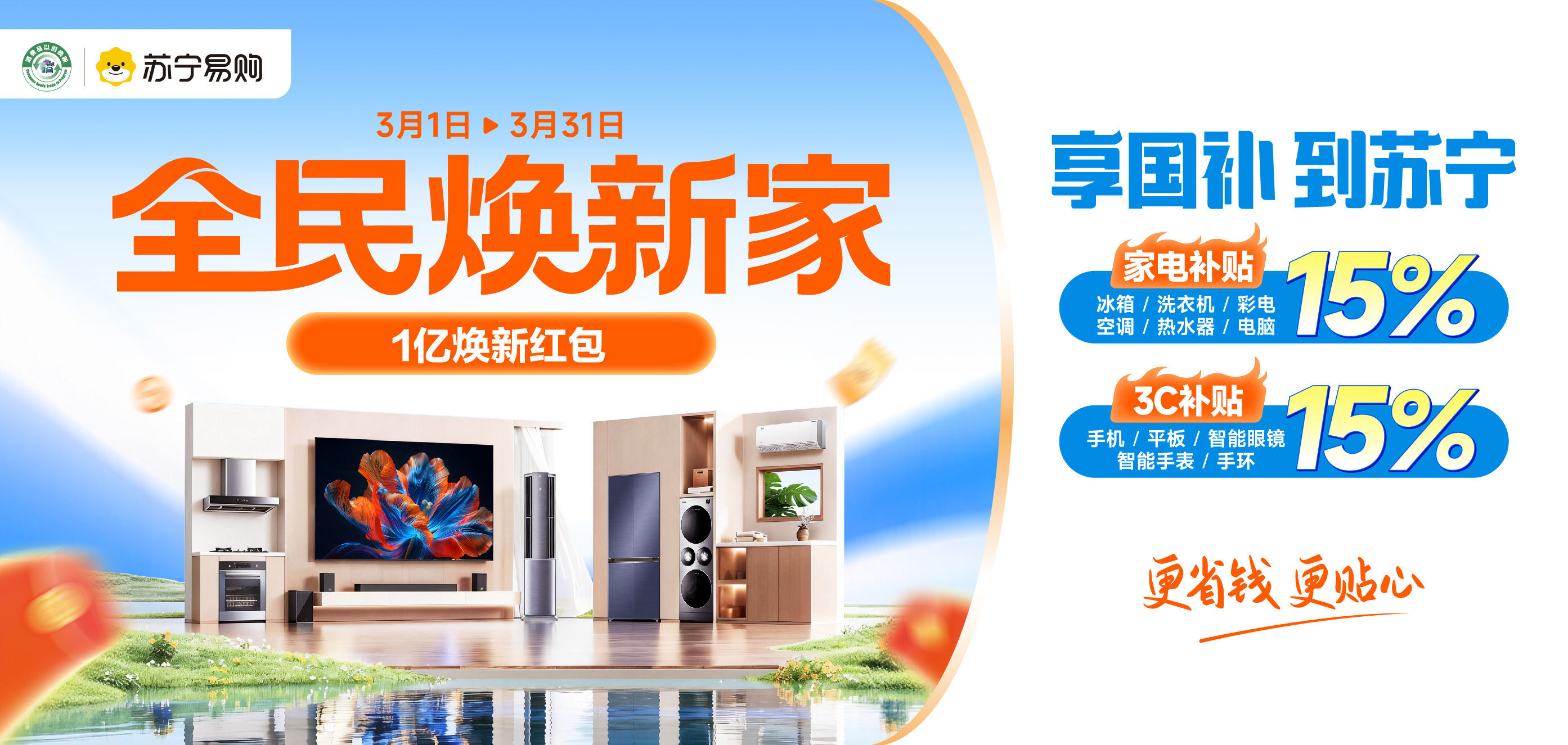 加力承接新一轮国补,助力春季家电家装消费活力释放,即日起至3月31日,苏宁易购集结百大头部品牌,全面开启“全民焕新家”大促。活动期间,苏宁易购将上新300款AI家电新品及爆品,并加码亿元消费补贴、爆款产品一口价、旧家电加价回收等多重优惠,升级洗碗机免费厨改、爆款空调免费安装、1V1专属管家全案定制等服务权益,加速家消费市场向绿色化、智能化升级。