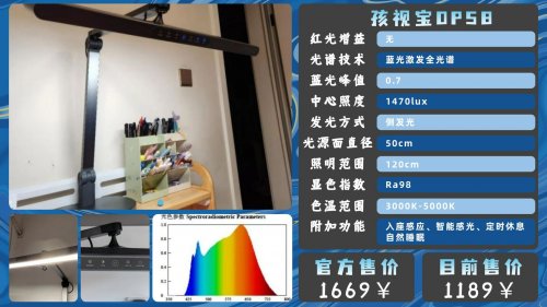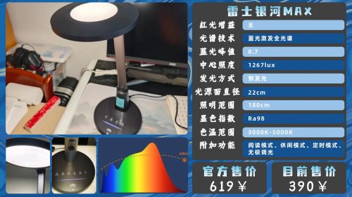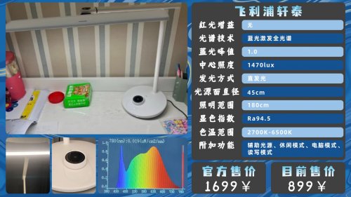 其最大亮点在于顶部的旋钮与手势双重操控,轻旋即可同步调节亮度与色温,挥手亦能实现智能切换,操作直观又充满科技感;搭配自动调光、入座即亮的智能判断系统,使用起来很贴心。不过它的蓝光峰值有点高了,达到了1.0,可能会造成孩子眼疲劳。