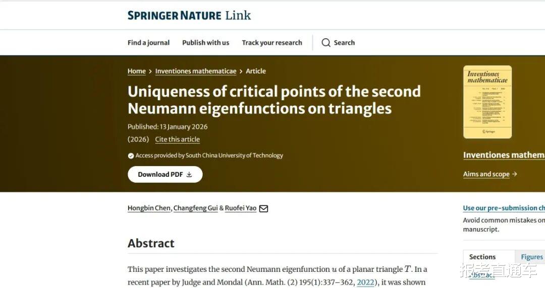 就在最近,数学界发生了一件足以让国内学术圈沸腾的“小”事——说它小,是因为研究对象仅仅是一个看似简单的平面三角形;说它大,是因为这项研究登上了世界四大顶尖数学期刊之一的《Inventiones Mathematicae》。这篇关于“三角形上第二诺伊曼特征函数临界点唯一性”的论文,由华南理工大学数学学院的姚若飞副教授与西安交通大学陈红斌教授、澳门大学桂长峰教授合作完成。要知道,在数学的金字塔尖,菲尔兹奖得主如Wendelin Werner、陶哲轩,以及麻省理工学院的David Jerison等大神都曾围绕相关的“热点猜想”进行过角逐。而咱们中国的青年学者,在这个困扰学界半个多世纪的难题上,硬是撕开了一道口子。这不仅仅是一次学术上的突围,更像是一个关于“长期主义”的最优解范本。
