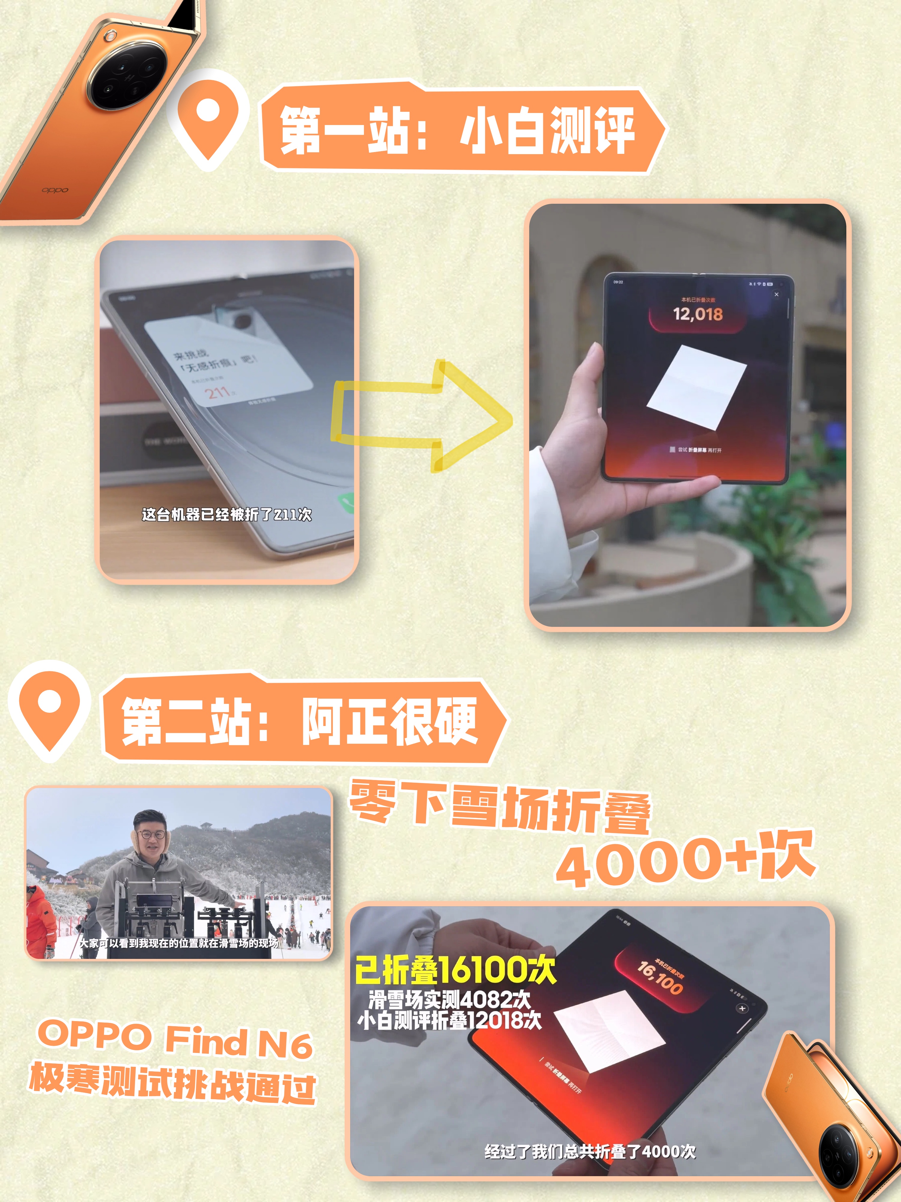 而且这10万次的开合堪称花式虐机🤦♂️博主“阿正很硬”就在温度零下的室外雪场折叠4000多次的,OPPO Find N6完全没有出现屏幕故障的情况,-20℃极寒耐用确实不是吹的~