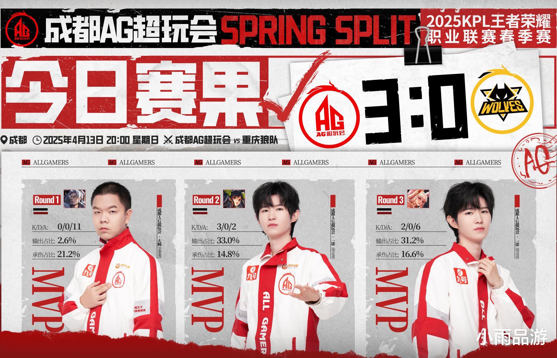 KPL春季赛常规赛第三轮第二周最后一日的比赛结束,一场万众瞩目的焦点大战落下帷幕,成都AG超玩会3比0轻松碾压重庆狼队,继续领跑S组。