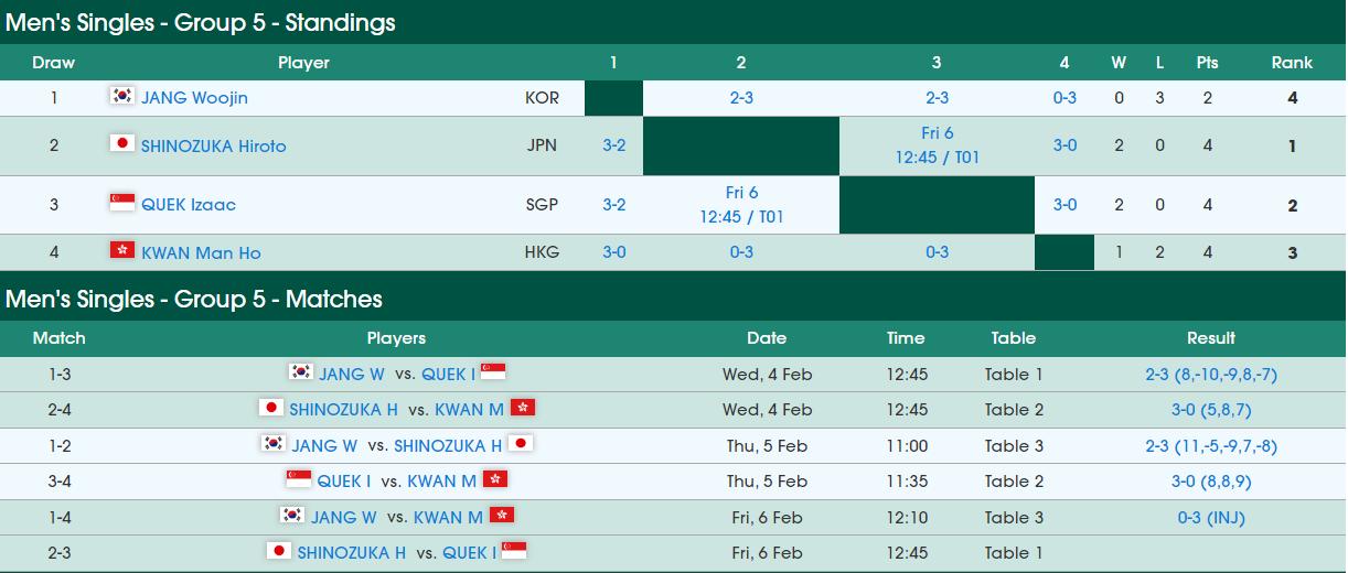 这个小组中,日本选手宇田幸矢目前两连胜提前晋级了16强。国乒的陈俊崧和中国香港的林兆恒将在明天直接对话,谁赢谁小组第二晋级16强。