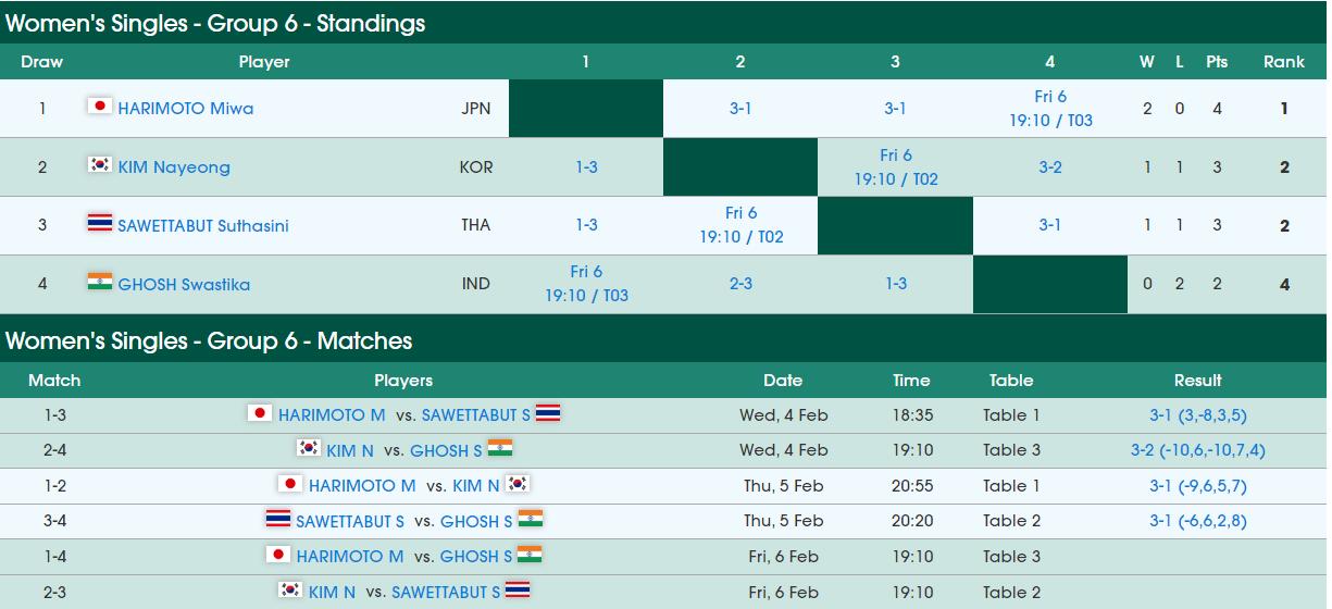 这个小组中,日本的张本美和两连胜提前锁定小组第一晋级16强。韩国的金娜英将会和泰国的索塔西尼最后一轮直接对话,谁赢谁拿到第二个晋级16强的名额。