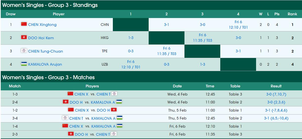 这个小组中,陈幸同目前取得了两连胜积4分排在小组第一位,由于面对目前第2和第3的球员交手战绩占优,陈幸同也已经提前锁定一个16强的席位了。剩下的一个席位将在中国香港的杜凯琹和中国台北的简彤娟之间产生,两人在明天直接对话,也是谁赢谁就拿到另一个16强的名额。