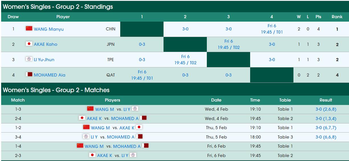 这个小组中,王曼昱目前取得两连胜,已经提前锁定了一个16强的名额。剩下的一个16强名额将在中国台北的李昱諄和日本的赤江夏星之间产生,两人也是明天最后一轮直接对话,谁赢谁晋级16强。