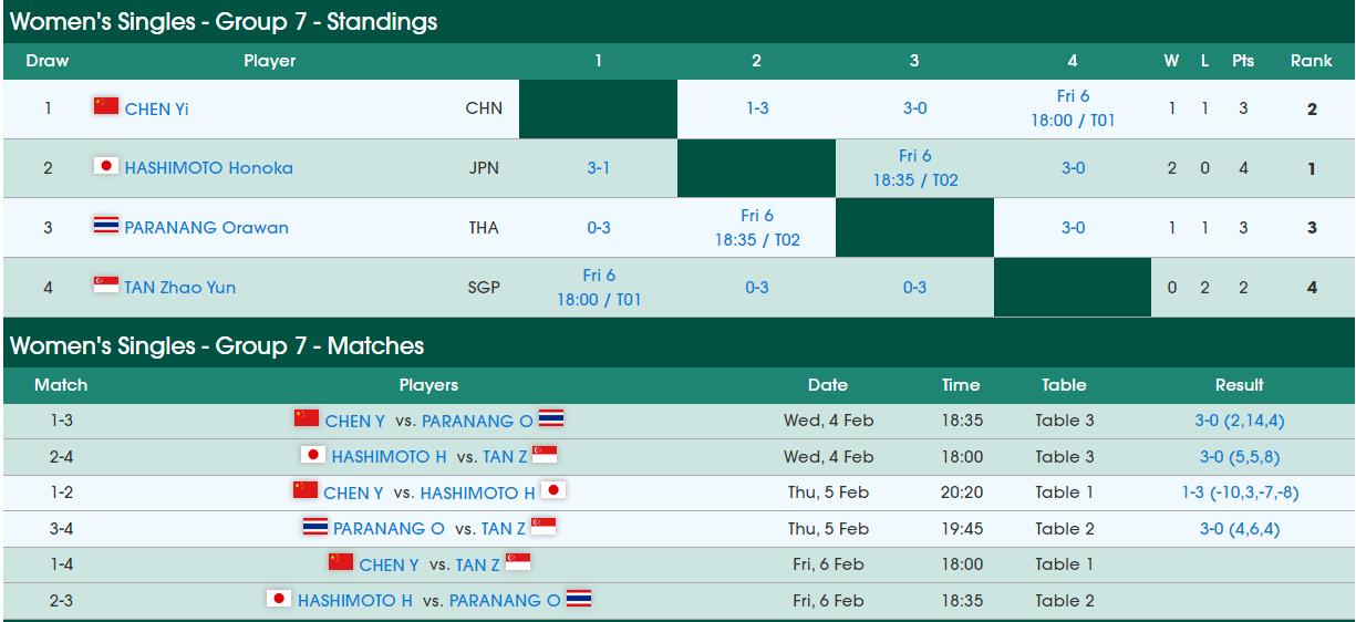 这个小组目前也是还没有人晋级16强。日本选手桥本帆乃香目前两连胜积4分排小组第一位,中国的陈熠和泰国的帕拉南都是1胜1负。最后一轮,桥本帆乃香将对阵帕拉南、陈熠将对阵小组垫底的中国香港选手陈昭澐。如果桥本帆乃香最后一轮输帕拉南、陈熠赢陈昭澐,就会出现三人都是2胜1负的情况,届时就要看三人相互之间战绩的局数胜负比了。
