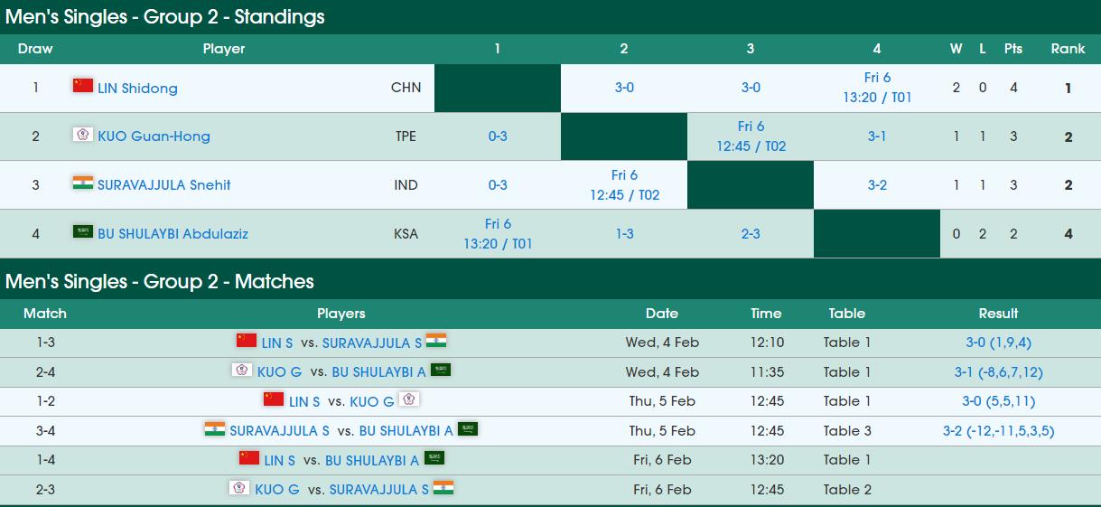 这个小组中,林诗栋目前小组赛两战全胜已经提前锁定小组第一晋级16强了。另一个名额将在中国台北选手郭冠宏和印度选手希特之间产生,两人将会在明天最后一轮直接对话,也是谁赢谁晋级的比赛。