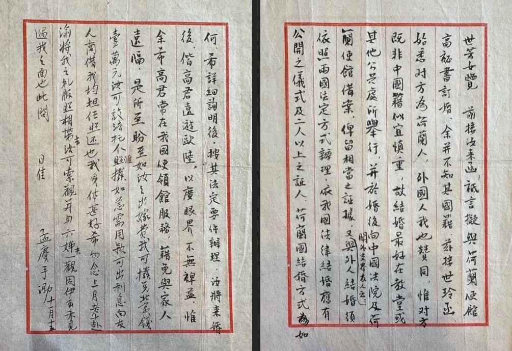 访谈︱施晔:除了房中术,荷兰汉学家高罗佩还研究什么?文丨施晔抗战时抵达重庆担任荷兰驻华领事馆秘书的高罗佩(Robert Hans van Gulik, 1910-1967)在这座城市结婚生子,结交众多学者和艺术界精英,由此奠定了其作为汉学家、书法家及琴家的地位。最近笔者在荷兰莱顿大学图书馆发现十余通由其后人捐献的高罗佩私人家书[1],通过这些信札可以再现其与中国名媛水世芳结婚成家始末,从而进一步厘清其在华的姻亲关系,并纠正学界一些以讹传讹的谬论[2]。文定厥祥水世芳(1919-2005)字绮琴,出生于北京,中学毕业于北平慕贞女校。因抗战爆发而西迁,先后就读于长沙临时大学(西南联大前身)及齐鲁大学,并于齐大获得历史社会学学位[3]。水世芳于民国三十二年六月就职于荷兰驻华领事馆,与该馆秘书高罗佩相识相恋,并于当年九月盟订婚约。当时世芳父亲水钧韶远在北平[4],因战争造成的交通阻隔而无法前往请示父母之命,只能依靠家书互通音讯。“烽火连三月,家书抵成金”[5],何况抗战延续了八年之久,因此这批家书弥足珍贵,虽然数量不多,包括水父四通、高罗佩三通、张守谦三通[6],以及世芳两位兄长各一通,却包含了大量世人并不知悉的信息,是厘清高罗佩在华姻亲关系及其并非张之洞外孙女婿的有力证据。民国三十二年十一月,水钧韶获悉了女儿与洋人订婚的消息,即刻写信给世芳表明其对这桩跨国婚姻的态度及诉求(图1):世芳女览:前接汝来函,只言拟与荷兰使馆高秘书订婚,余并不知其国籍。兹接世玲函,始悉对方为荷兰人。外国人我也赞同,惟对方既非中国籍,似宜慎重。故结婚最好在教堂或其他公共处所举行,并于婚后向中国法院及荷兰使馆备案,俾留相当之证据。又闻外交界友人云,与外国人结婚须依照两国法定方式办理,依我国法律结婚应有公开之仪式及二人以上之证人。荷兰国结婚方式如何,希详细询明后,按其法定要件办理。汝将来婚后,偕高君远游欧陆,以广眼界,不无禆益。惟余希高君常在我国使领馆服务,藉免与家人远隔,是所至盼。至如汝之出嫁费,我可拨兑北京钱一万元,汝可设法托人(照)汇拨。如急需用款,可出利息向友人商借,我均担任照还也。我身体甚好,希勿念。上月老十赴渝,将我之礼服照相带去,汝可索观,并与六姊夫一观。因伊云未见过我之面也。此问日佳。孟赓手泐十一月十五